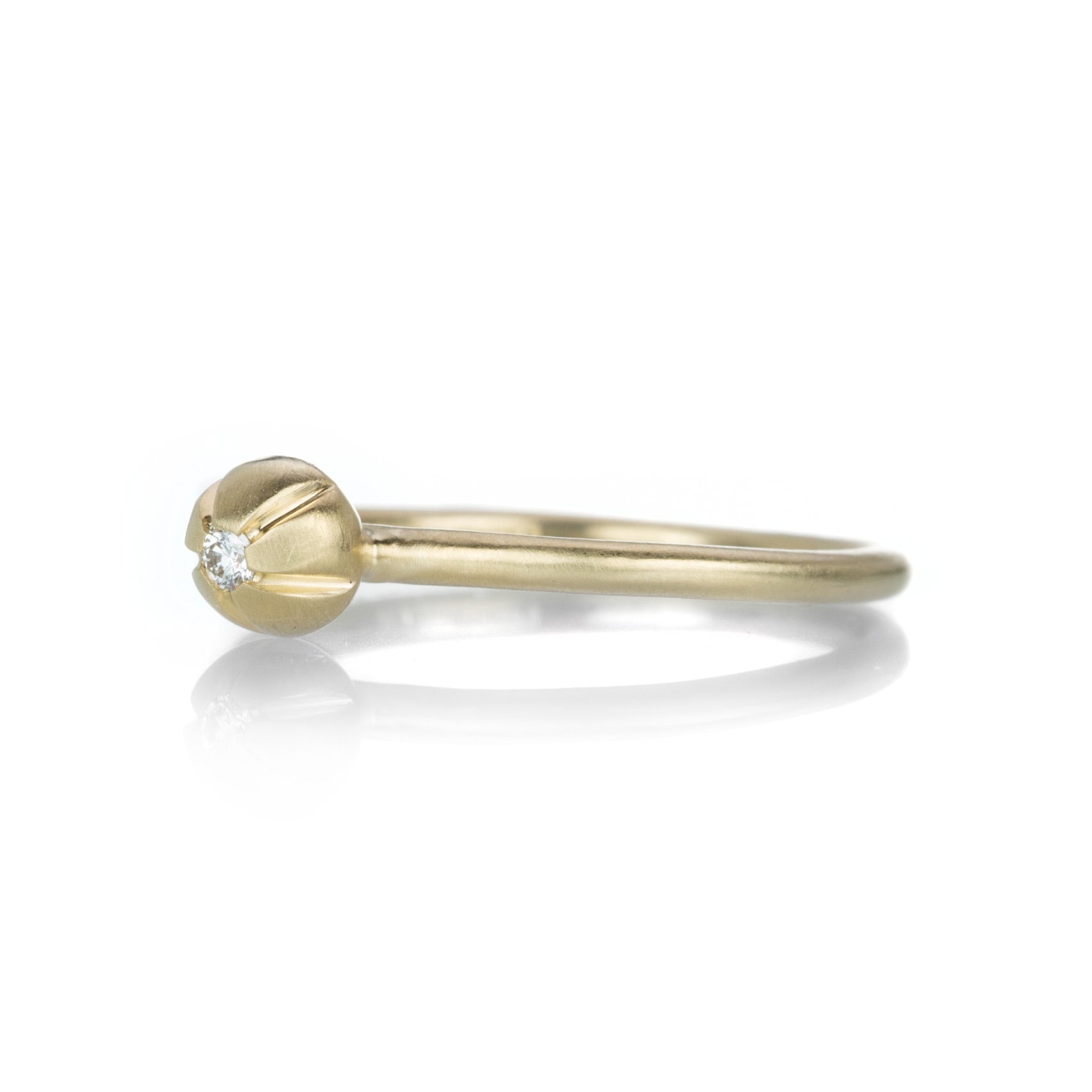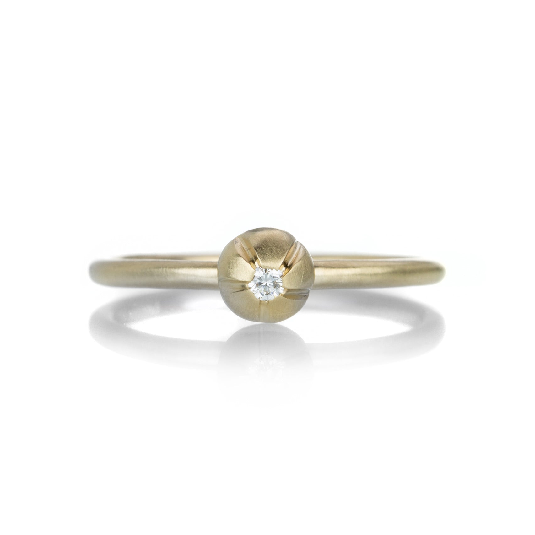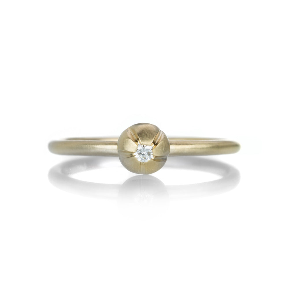 With a hint of dewy sparkle, this 14k yellow gold ring from Nicole Landaw will add a flowery glow to any stack! A delicately detailed floral blossom design holds a single sparkling diamond. Size 6.5. Handcrafted in Hudson River Valley, NY, U.S.