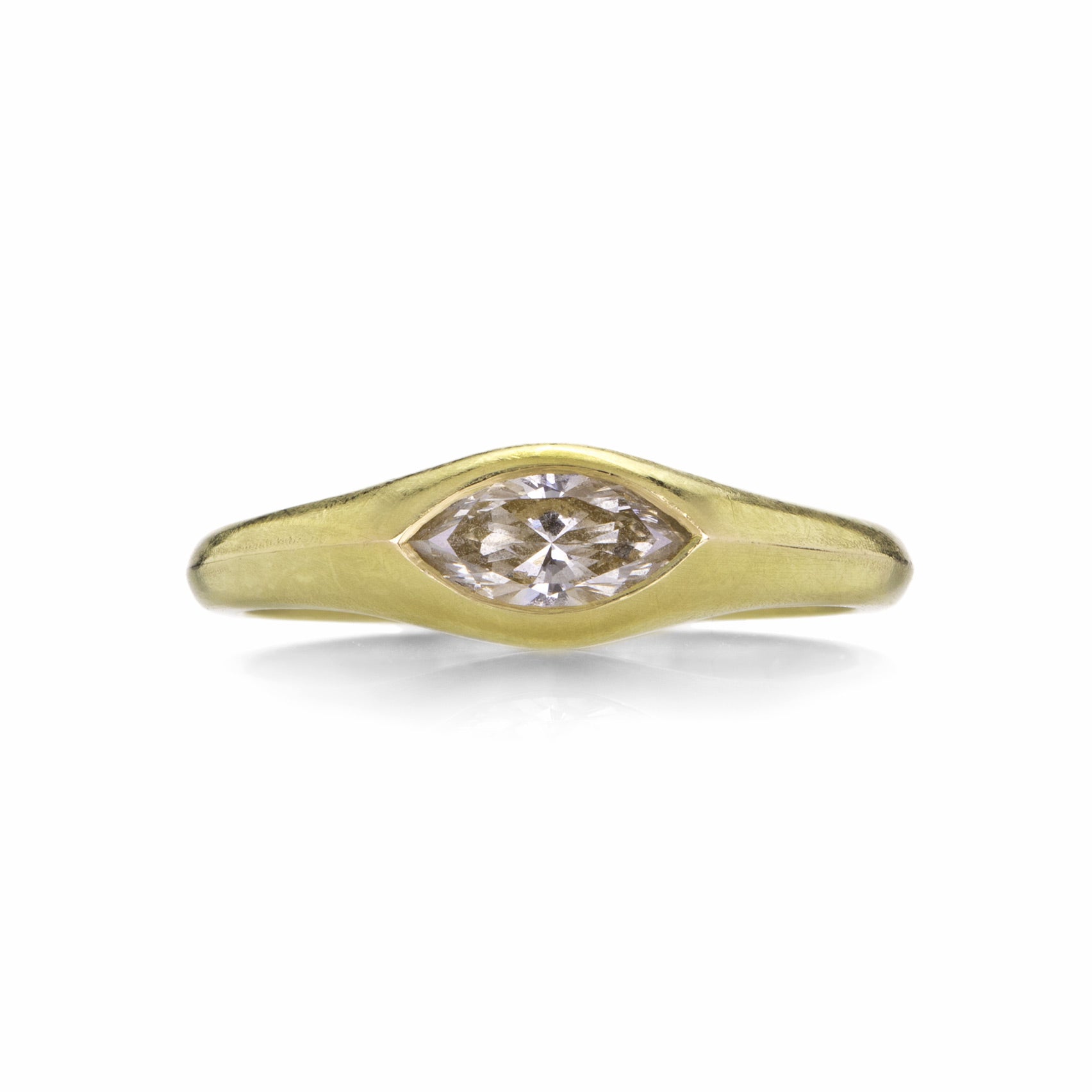 A stunning, versatile layering piece, this 18k yellow gold signet ring from Barbara Heinrich brings the heat with a 0.52ct marquise brown diamond at its center. The stone sits flush in a brushed, tapering knife edge band. Size 7. Handcrafted in Rochester, NY, U.S.