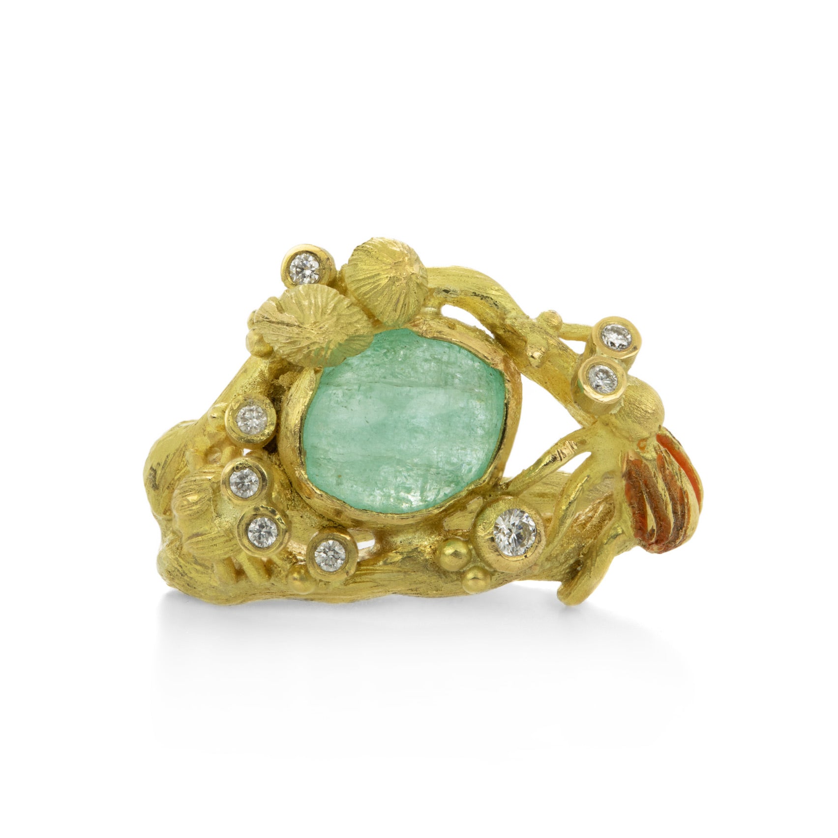 Get your garden goddess vibes on in this 18k yellow gold ring from Lene Vibe, featuring a 2.22ct oval Paraiba tourmaline cabochon as the star. Meticulously carved critters and shrooms sparkle with white diamonds totaling 0.10cttw in this whimsical piece. Size 6.75. Handcrafted in Denmark.