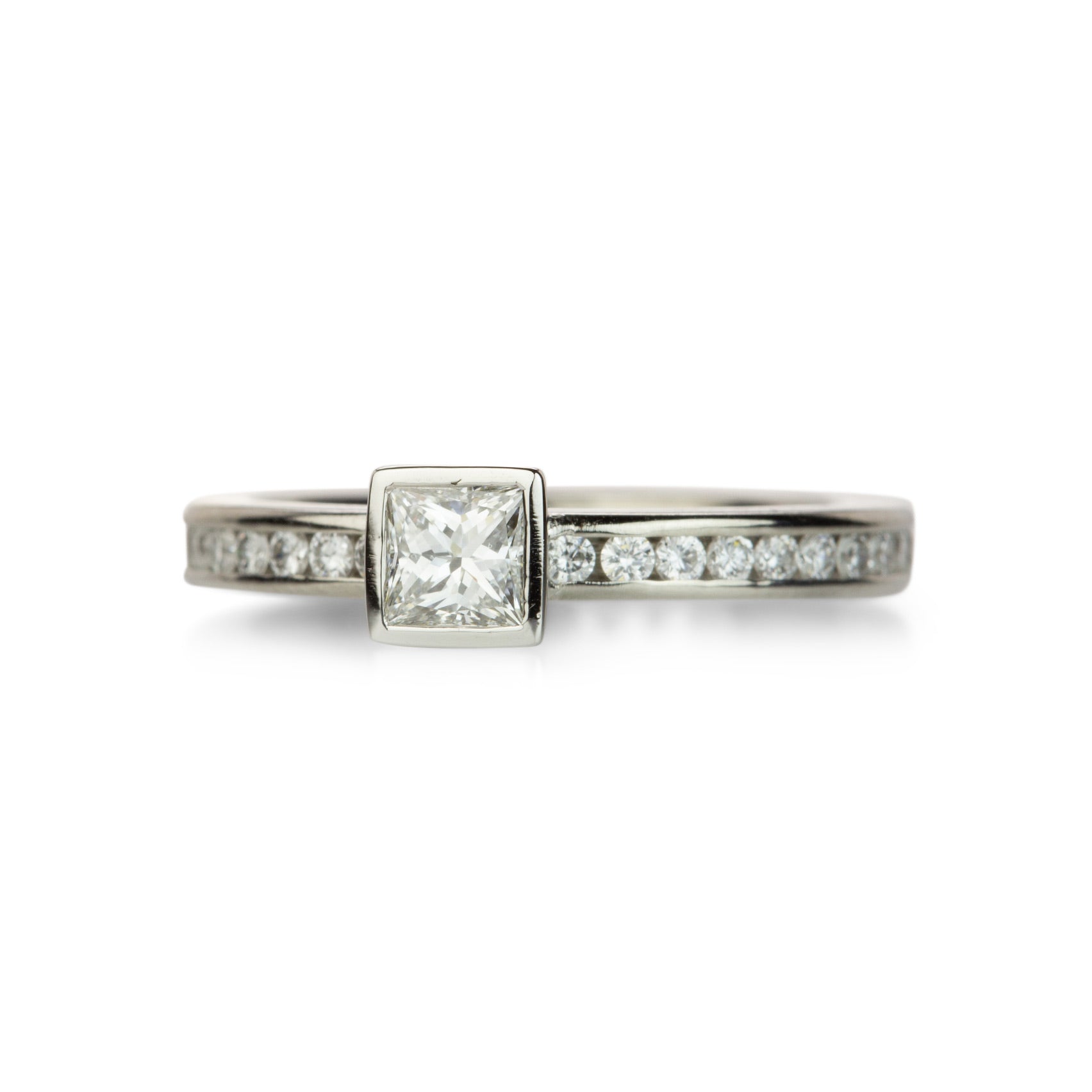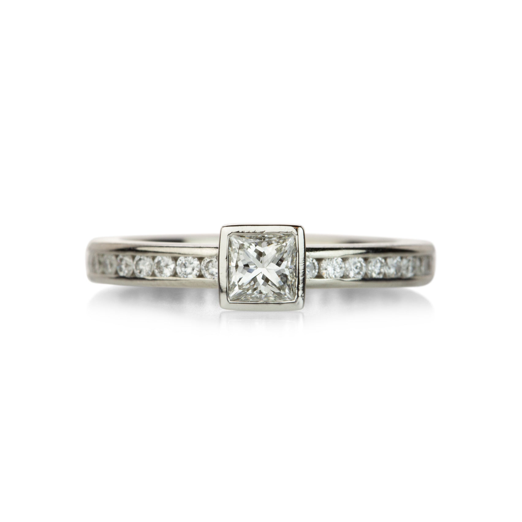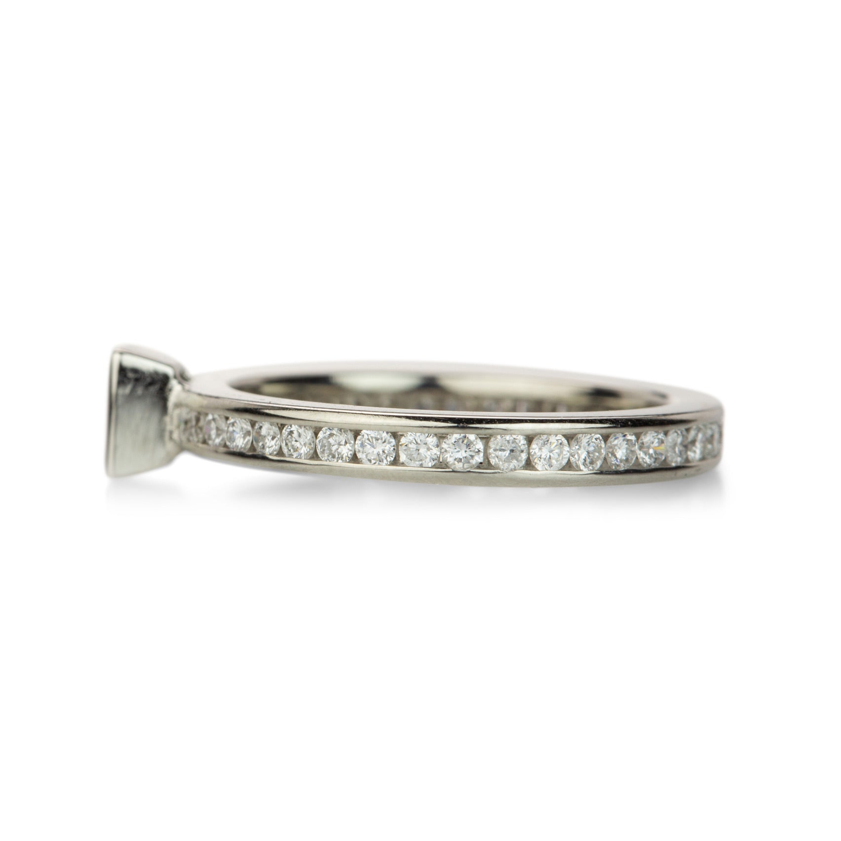 This perfectly polished platinum ring from Barbara Heinrich features a dazzling bezel set 0.37ct white princess cut diamond. The sparkling stone sits on a channel shank, highlighted by diamonds totaling 0.51cttw. A truly romantic engagement ring, this piece will be at home as the anchor in a stunning wedding stack! Size 5.5. Handcrafted in Rochester, NY, U.S.