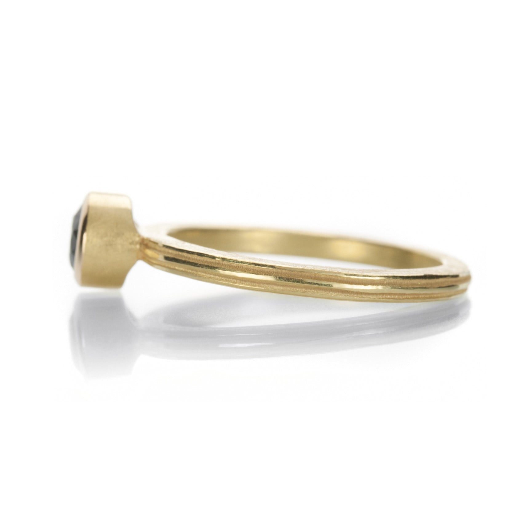 Sing your blues away in this 18k yellow gold Barbara Heinrich creation. A grooved band holds a round, bezel set 0.47ct blue sapphire. The rich blue stone would look perfect in a stack or on its own as the star! Size 6.25. Handcrafted in Rochester, NY, U.S.