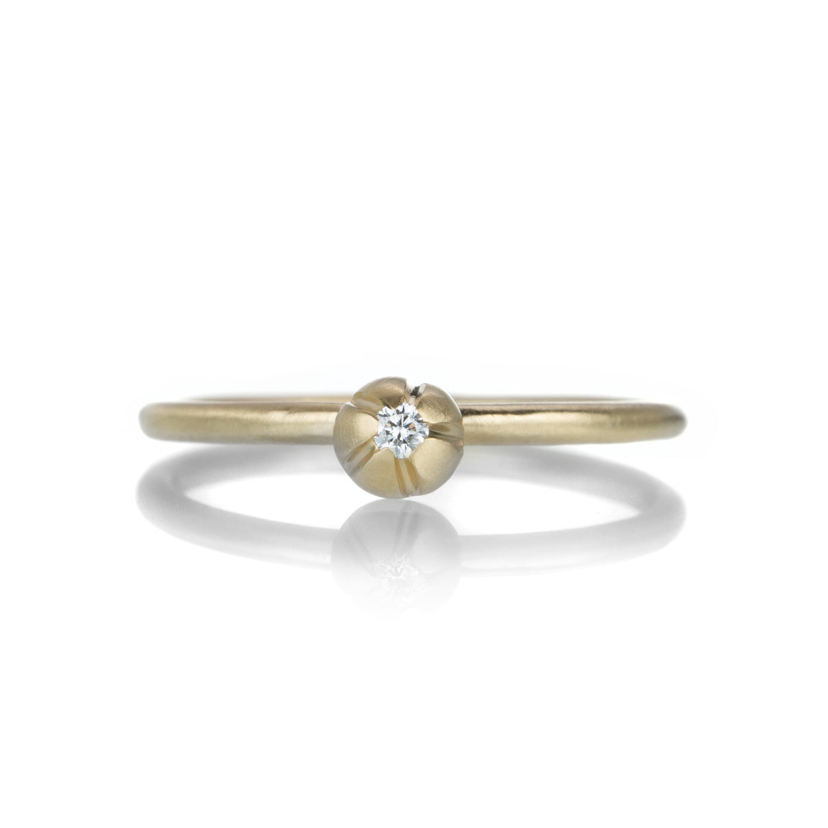 With a hint of dewy sparkle, this 14k yellow gold ring from Nicole Landaw will add a flowery glow to any stack! A delicately detailed floral blossom design holds a single sparkling diamond. Size 6.5. Handcrafted in Hudson River Valley, NY, U.S.