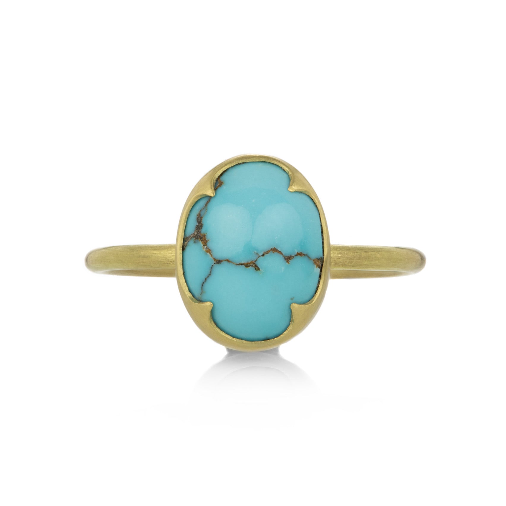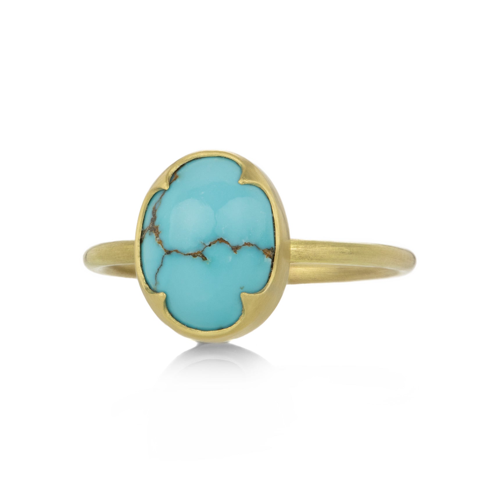 An 18k yellow gold ring with a smooth, oval, 2.9ct Persian Turquoise set in a bezel. Stone measures 3/8" x 1/2" on a 1.5mm wide band. Size 6.5. Handcrafted in Hudson Valley, NY, U.S.
