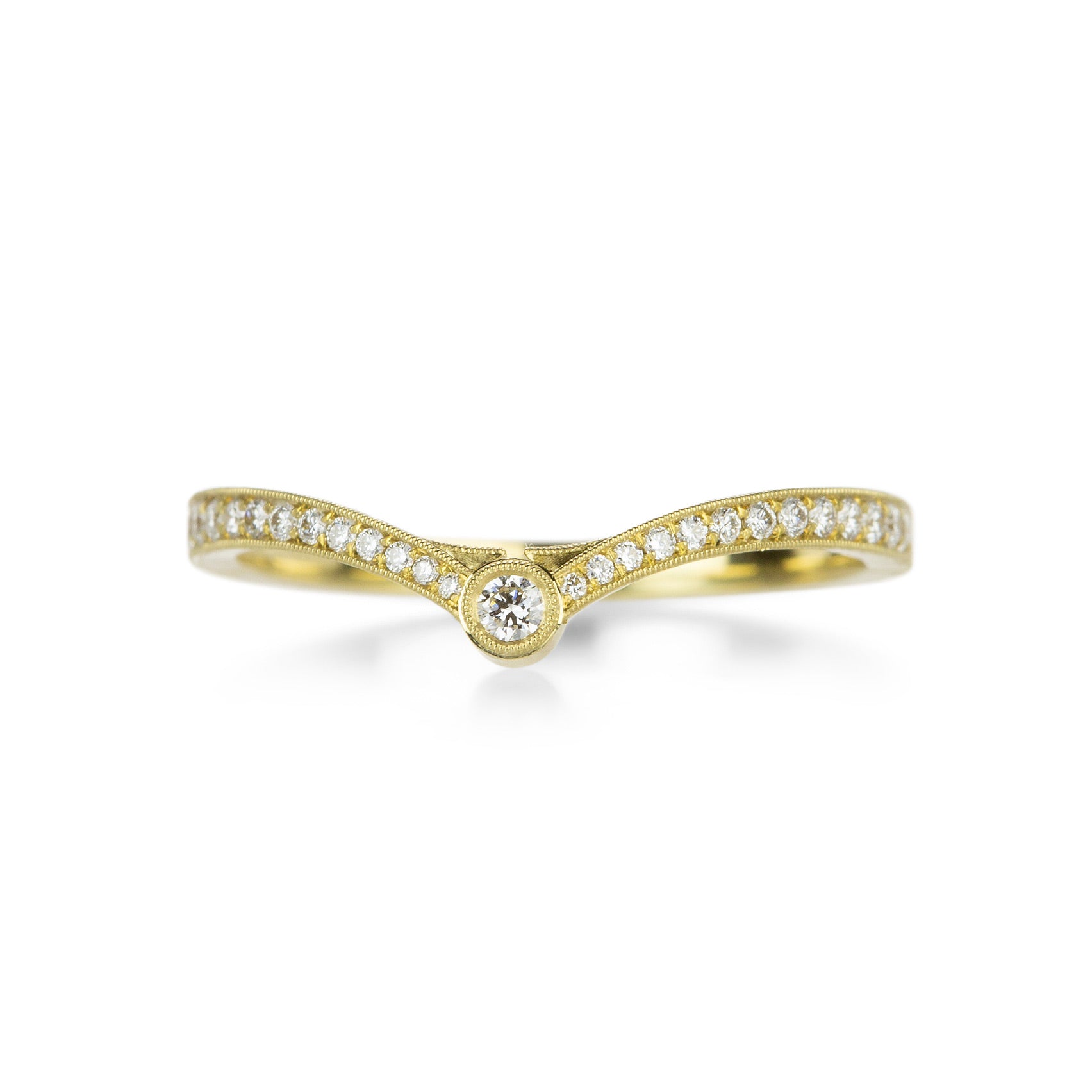 Dress your engagement ring in the luscious contours of this 18k yellow gold band from Erika Winters. A single bezel set round diamond shines brightly at the point, supported by an ever so slightly graduating vine of brilliant round white diamonds totaling 0.18cttw (F-G VS). Featuring the artist’s signature milgrain work and brushed finish, this band width measures 2mm. Size 6.5. Handcrafted in Seattle, WA, U.S.