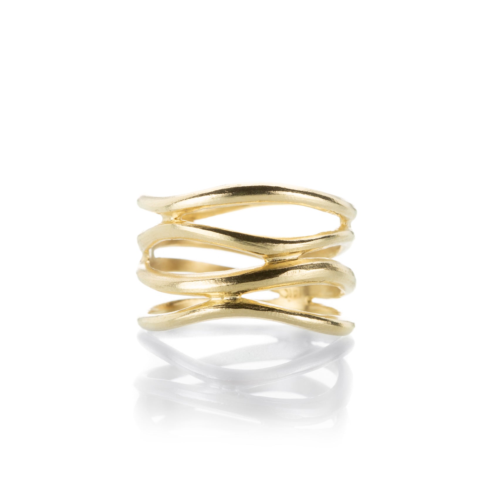 Ride the golden waves all the way to your happy place. This 14k yellow gold, four row waving hewn ring from Nicole Landaw gives endless summer vibes. Band measures 1/2" wide. Size 6.5. Handcrafted in Hudson River Valley, NY, U.S.