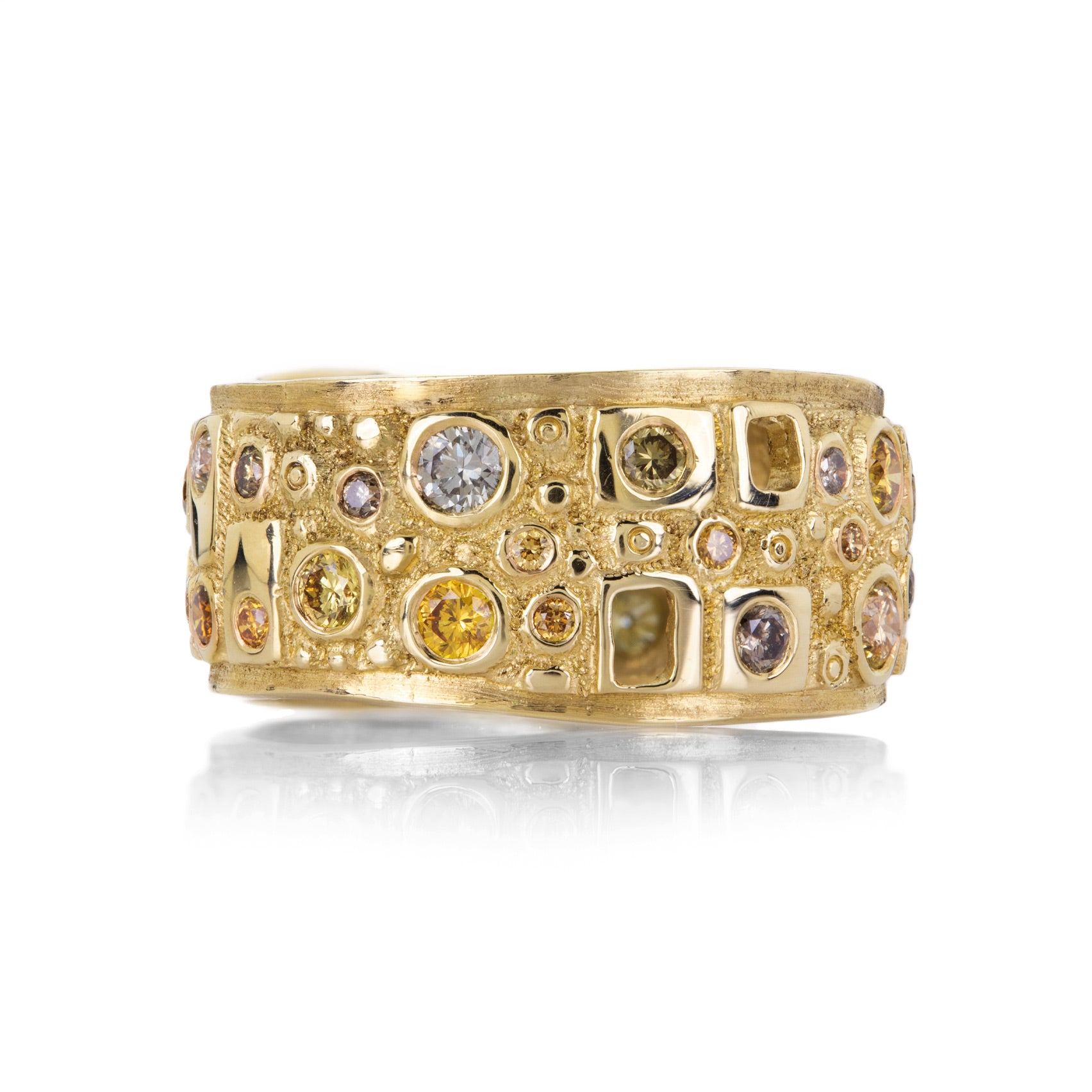 Wear the wondrous windows to your soul in this 18k yellow gold statement band from Audrius Krulis. Scattered, bezel set multicolored diamonds pave the band’s face with the light of a thousand sparks. Band measures 10.5mm wide. Size 8.5. Handcrafted in Montrose, NY, U.S.