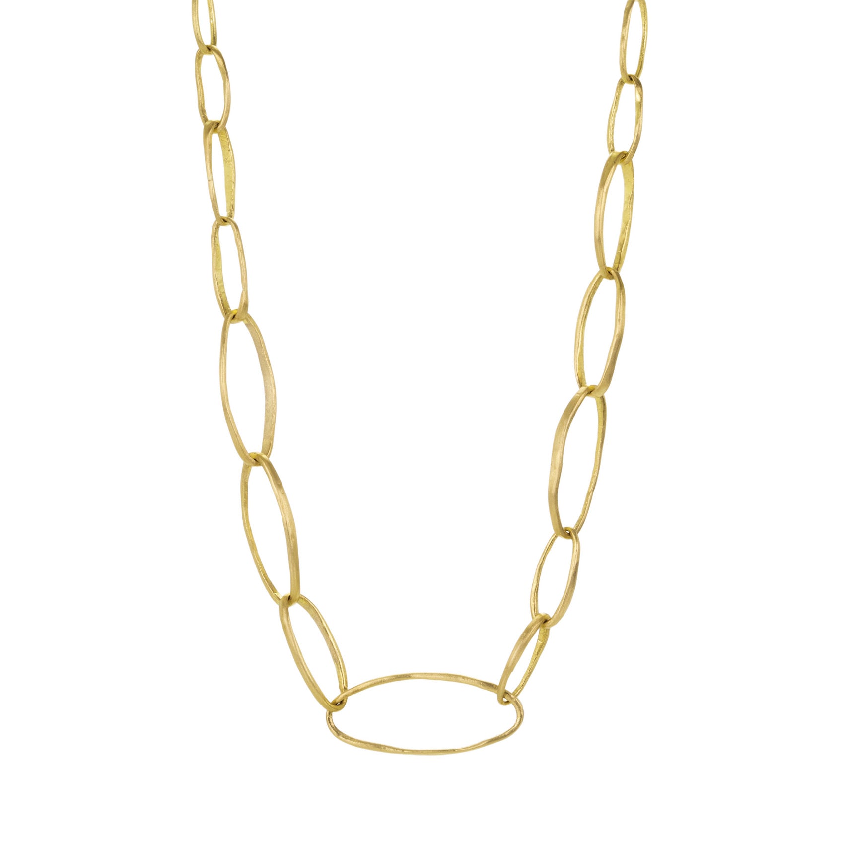 Drape yourself in luxury in this 22k yellow gold handmade chain from Rosanne Pugliese. Mixed large and small organically oval hammered links form a long line of airy, luscious precious metal bliss. A keshi pearl hangs at the hook clasp. Total length measures 18 1/4". Handcrafted in Brooklyn, NY, U.S.