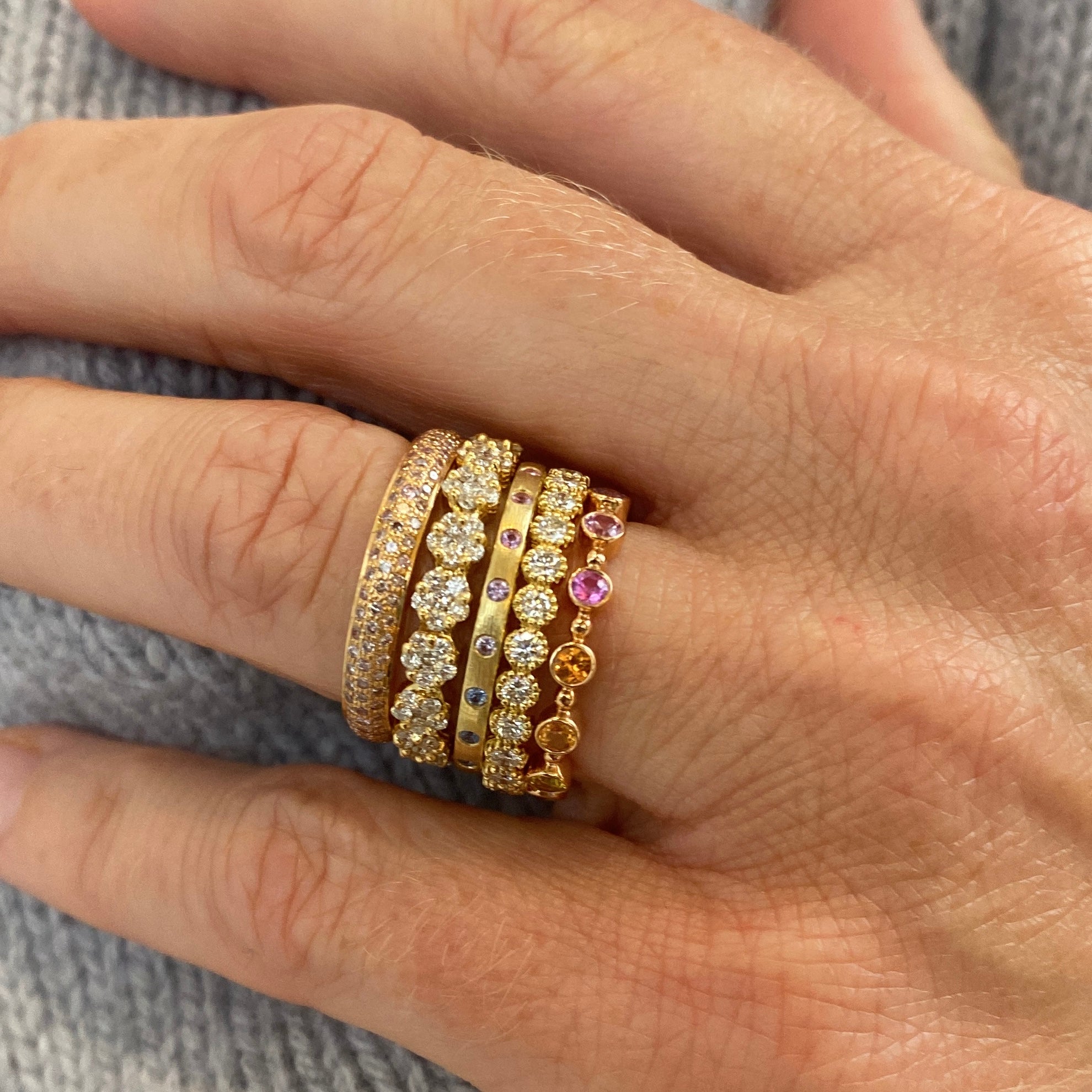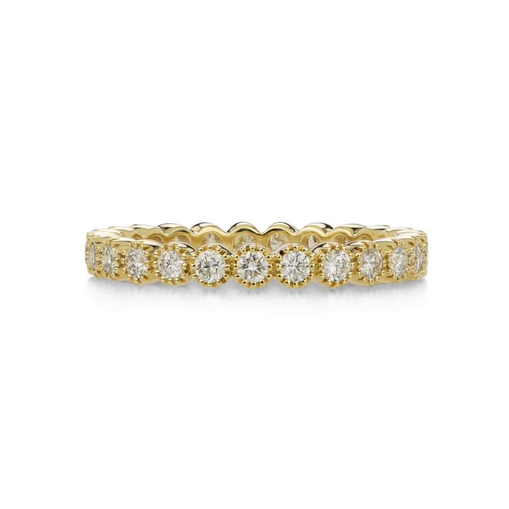 Light and sweet with a lacy, feminine demeanor, this Sethi Couture eternity band is a perfect addition to your wedding stack or everyday stack! Featuring white diamonds totaling 0.73cttw bezel set in 18k yellow gold, this ring is ready to captivate you! Size 7. Handcrafted in Indore, India.