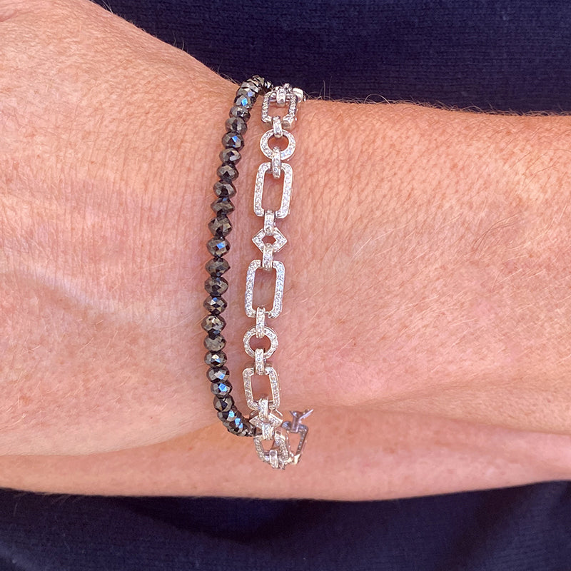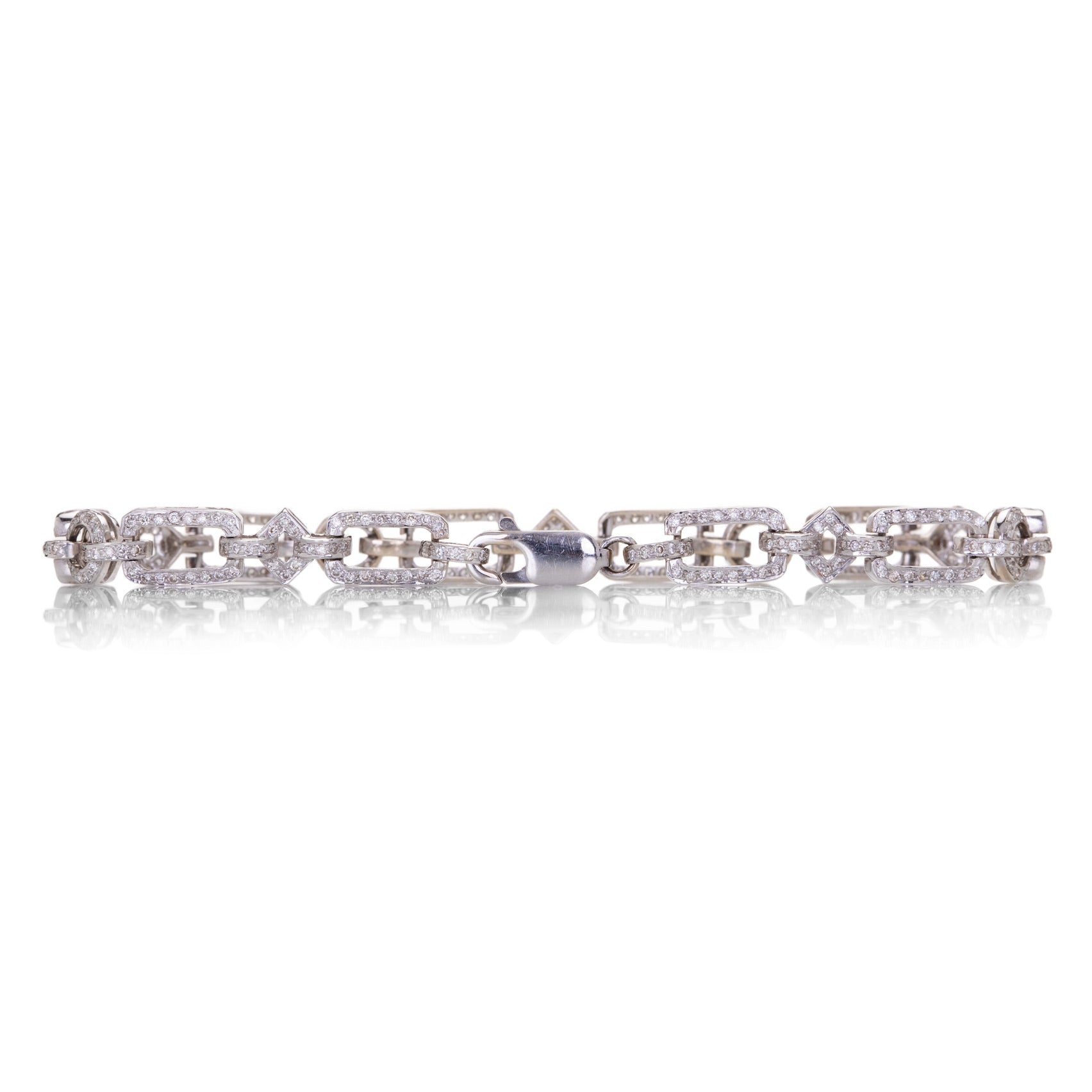 Give your wrist stack a fresh, modern take on luxury vintage design in this 18k white gold bracelet from Sethi Couture. Alternating rectangle, diamond, and round links are set with brilliant cut white diamonds totaling 2.00cttw. Total length measures 7 1/8" including lobster clasp. Handcrafted in Indore, India.