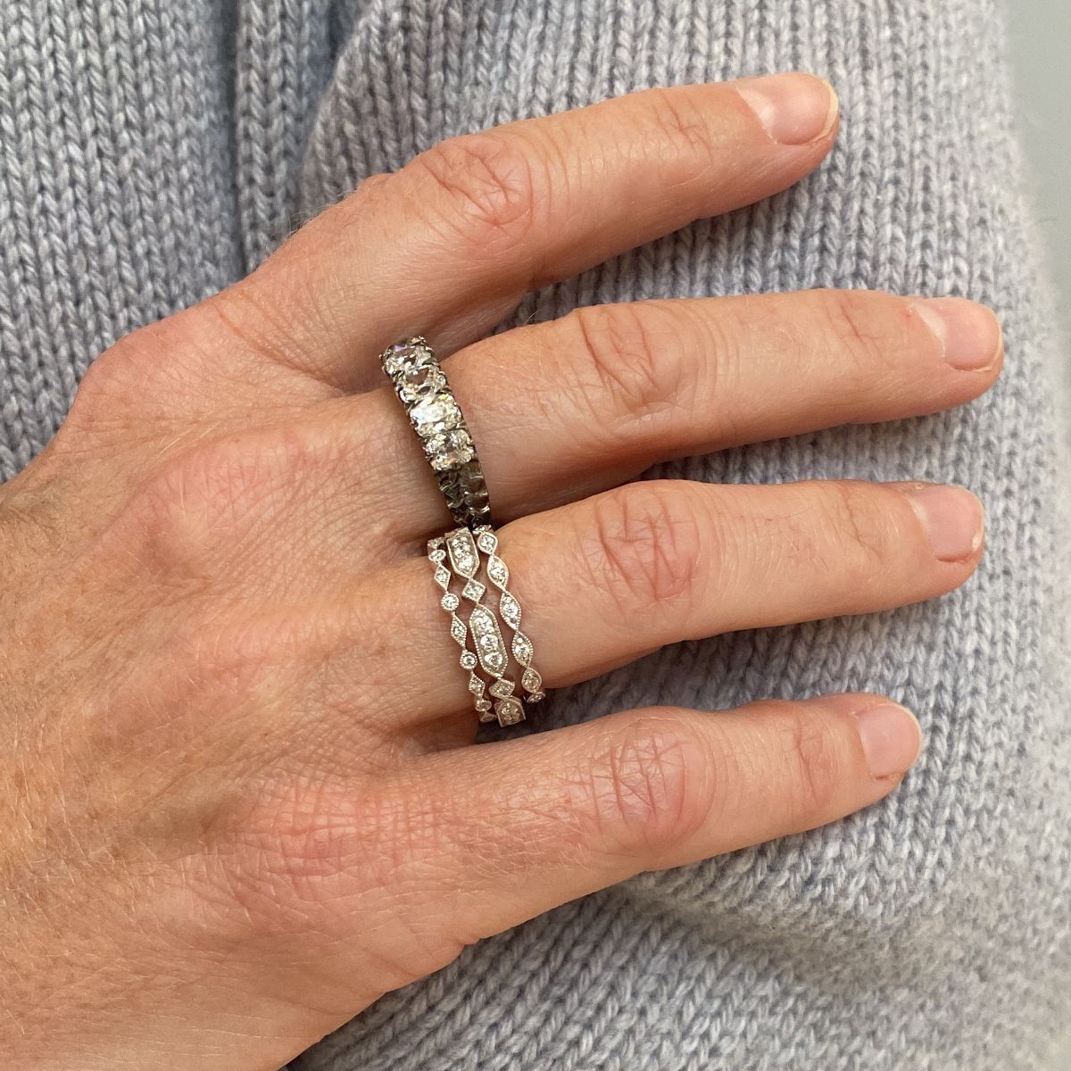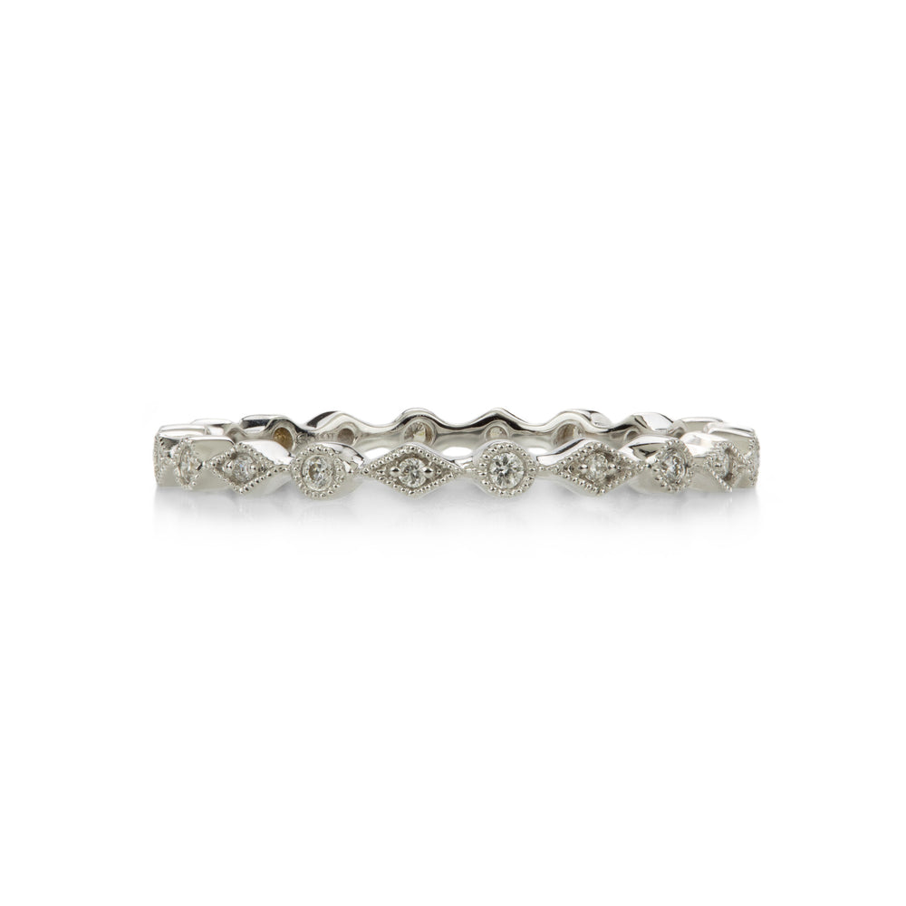 Delicate and feminine, this 18k white gold eternity band from Sethi Couture would be such a sweet wedding band, or a wonderful addition to your stack of rings! Round and marquise shaped segments hold sparkling white diamonds totaling 0.10cttw. Size 6. Handcrafted in Indore, India.