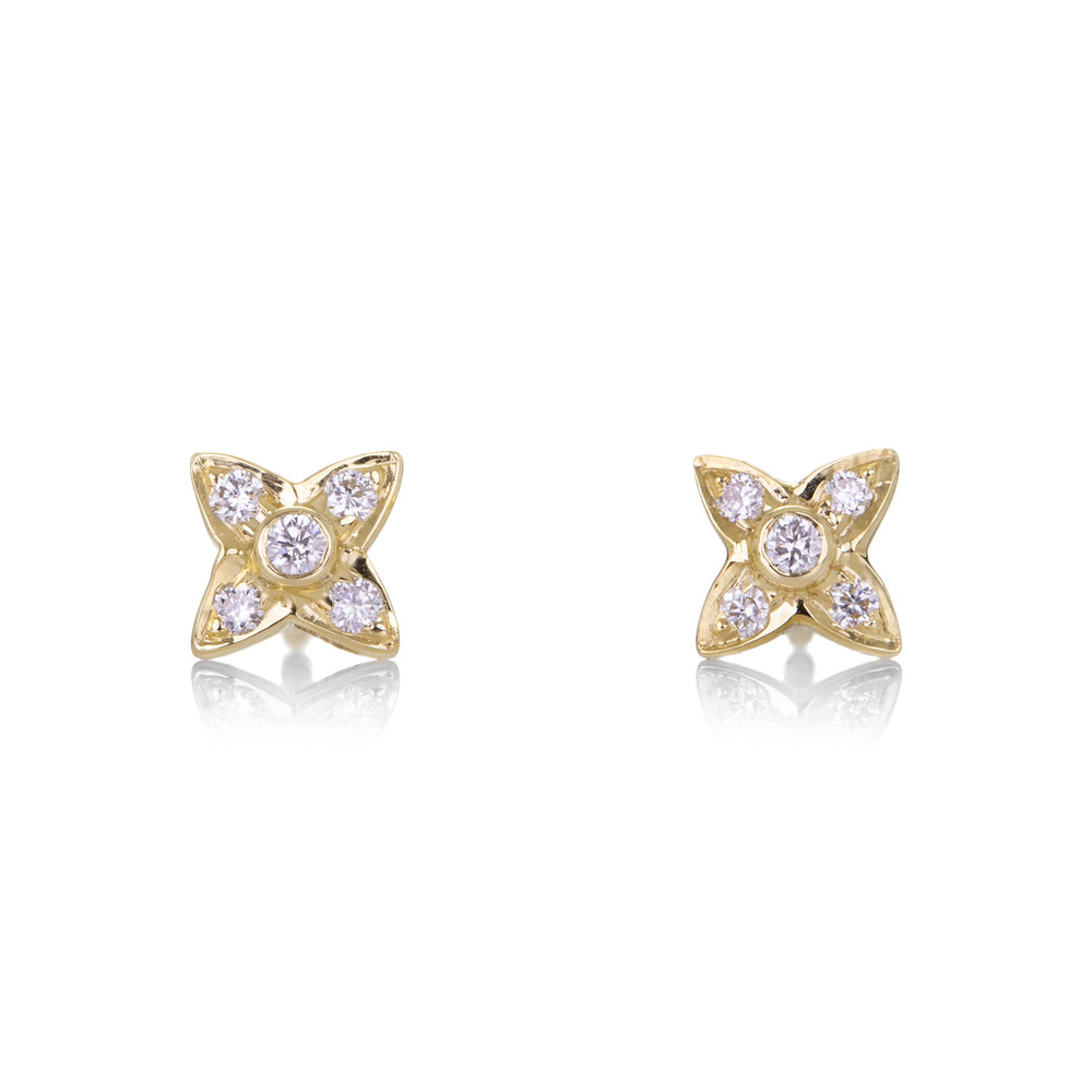 A lovely, luxurious accent for every day, this pair of 18k yellow gold studs from Sethi Couture sparkles with flowery diamonds totaling 0.14cttw. Wear these alone or add them to your ear party! Earrings measure just over 1/4”. Handcrafted in Indore, India.