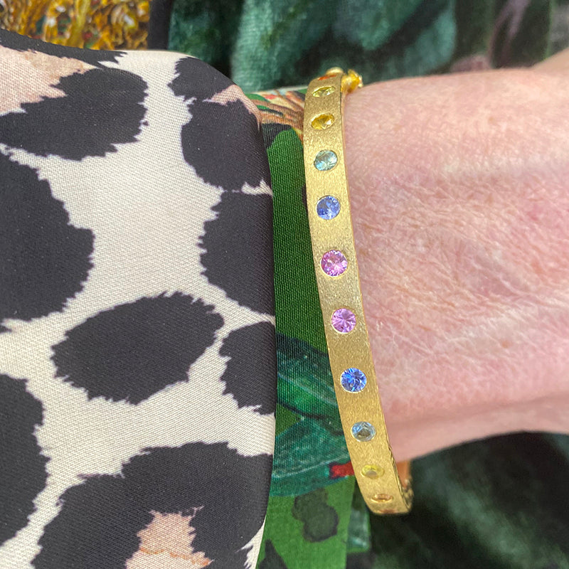 A sleek, colorful statement piece when worn alone or anchoring a sparkly stack, this 18k yellow gold hinged bangle from Sethi Couture features multicolored sapphires totaling 1.84cttw set into the surface. Finished with a double locking clasp, the inner diameter measures 2 3/8" x 2". Handcrafted in Indore, India.
