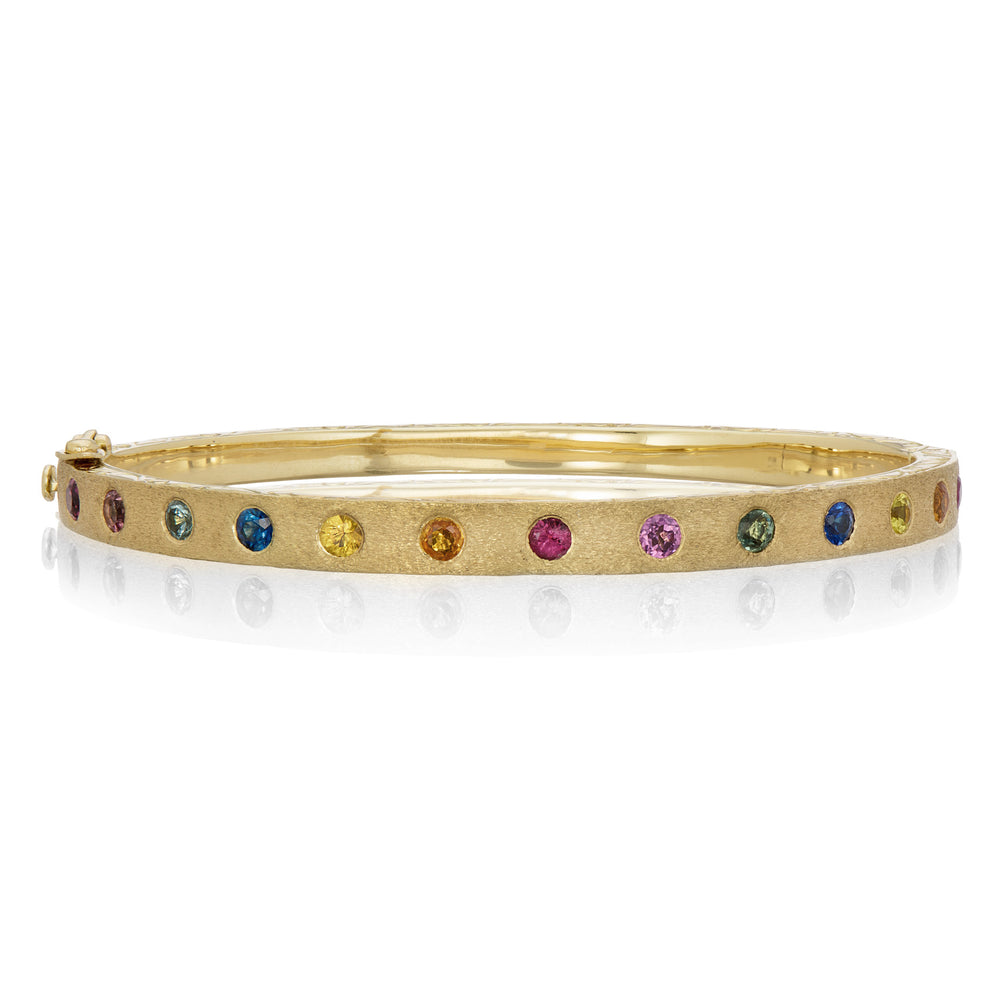 An 18k yellow gold hinged bangle bracelet with multicolored sapphires totaling 1.84cttw. Inner diameter of bracelet measures 2 3/8" x 2". Handcrafted in Indore, India.