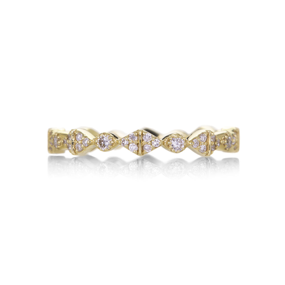 Whether you’re building up your stack or saying I do, this mixed setting Sethi Couture ring gives us all the feels! The 18k yellow gold band ring stars singles and trios of white diamonds totaling 0.34cttw. Delightfully dazzling, this ring would accompany any engagement ring with style! Size 6. Handcrafted in Indore, India.