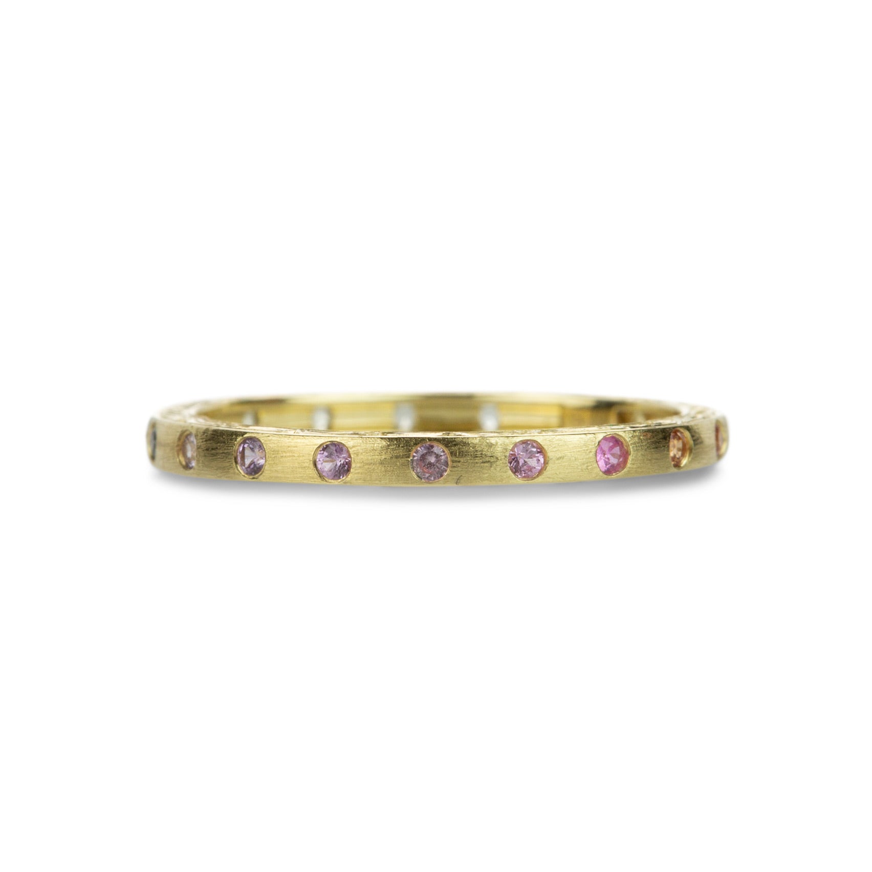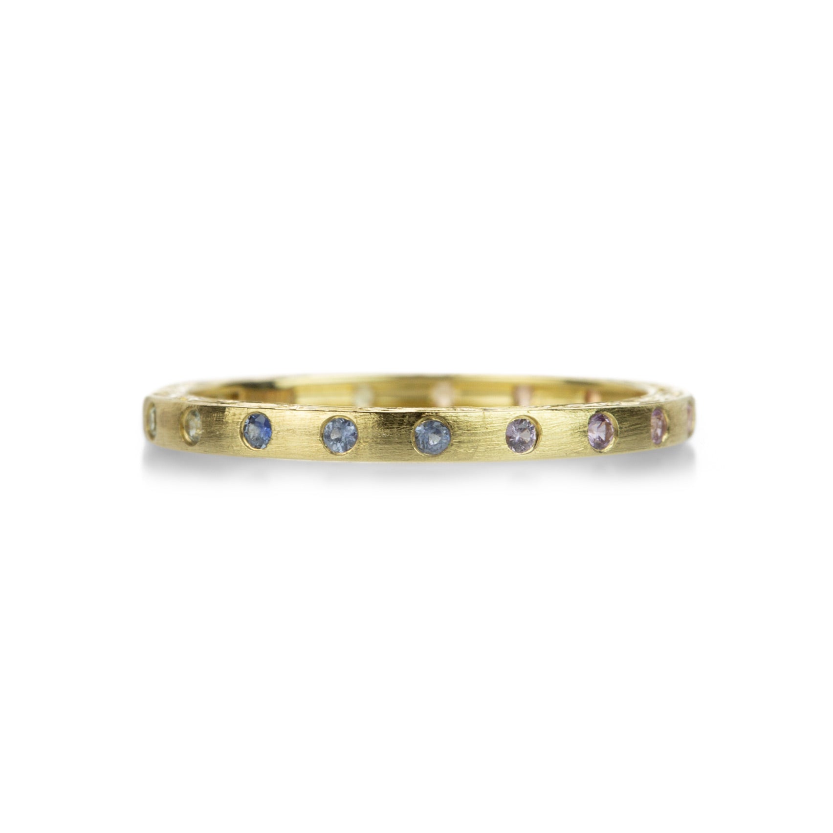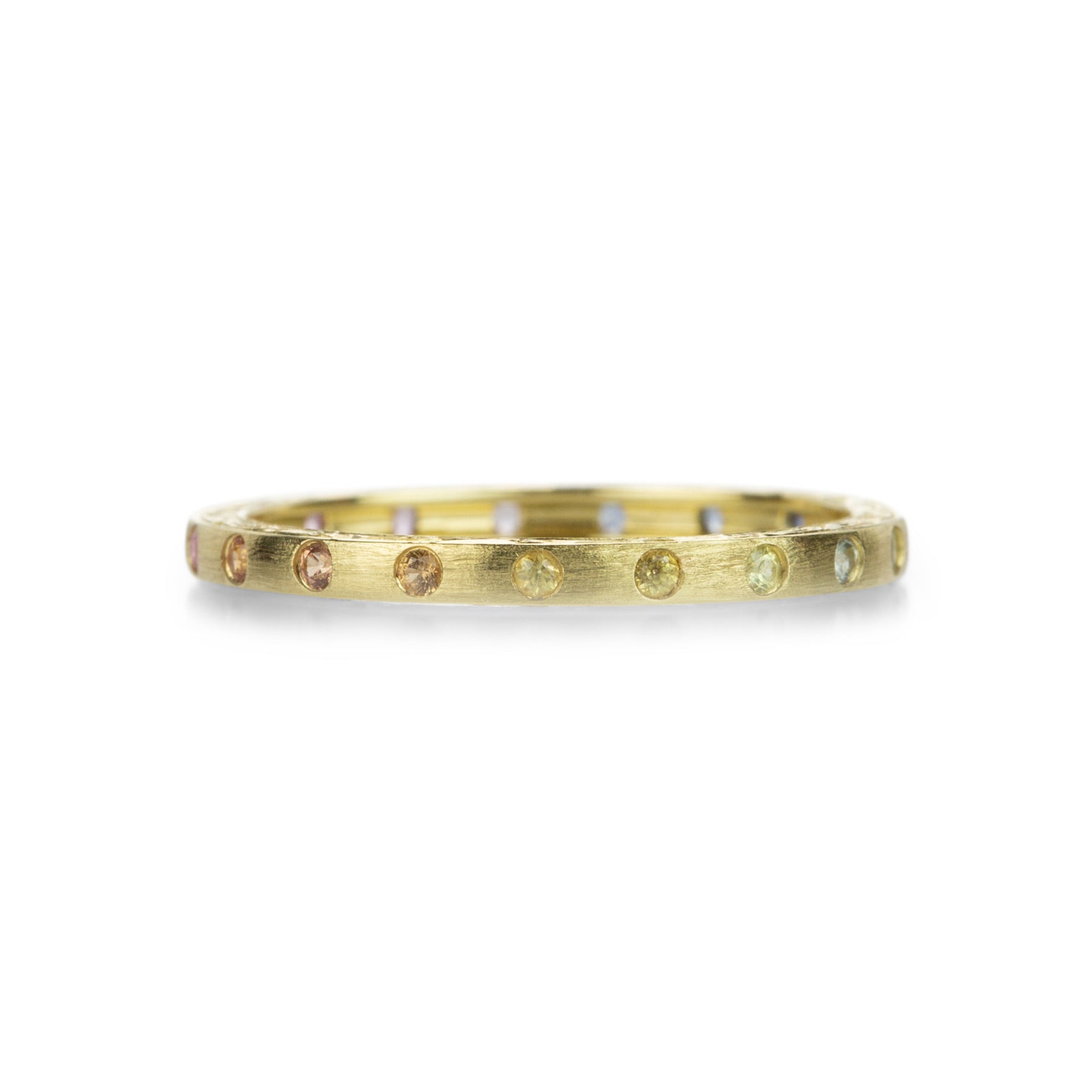 This narrow, 2mm 18k yellow gold band from Sethi Couture features fun, festive rainbow sapphires totaling 0.24cttw. Lots of color in a sweet little package! Size 7. Handcrafted in Indore, India.