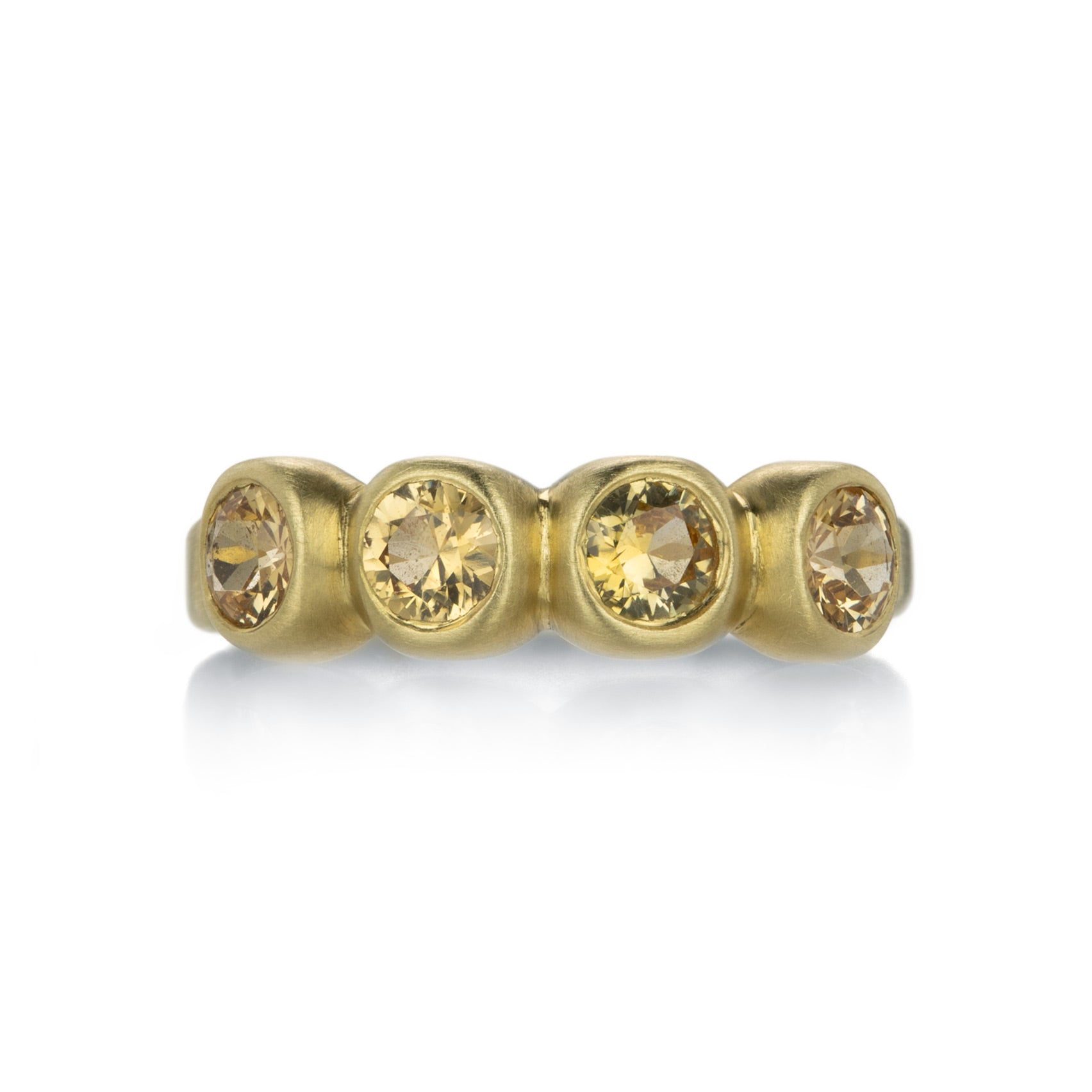 Not for the faint of heart, this naturally bold 18k yellow gold ring from Marian Maurer features four 4mm round, golden sapphires, organically bezel set in a chunky, satiny band of gold. Size 6.75. Handcrafted in Brooklyn, NY, U.S.