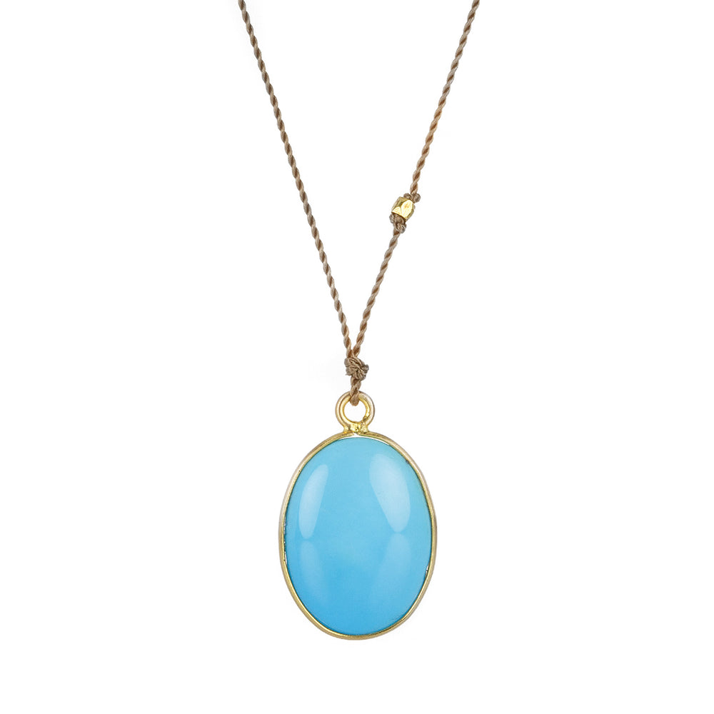 Elevate your layered look with a casually chic necklace from Margaret Solow. Featuring an 18k yellow gold bezel set, oval Sleeping Beauty turquoise pendant, this necklace will bring the color you crave. Stone measures 1/2" x 3/4" on an 18" cord with a faceted gold bead accent and a 14k yellow gold lobster clasp. Handcrafted in Los Angeles, CA, U.S.