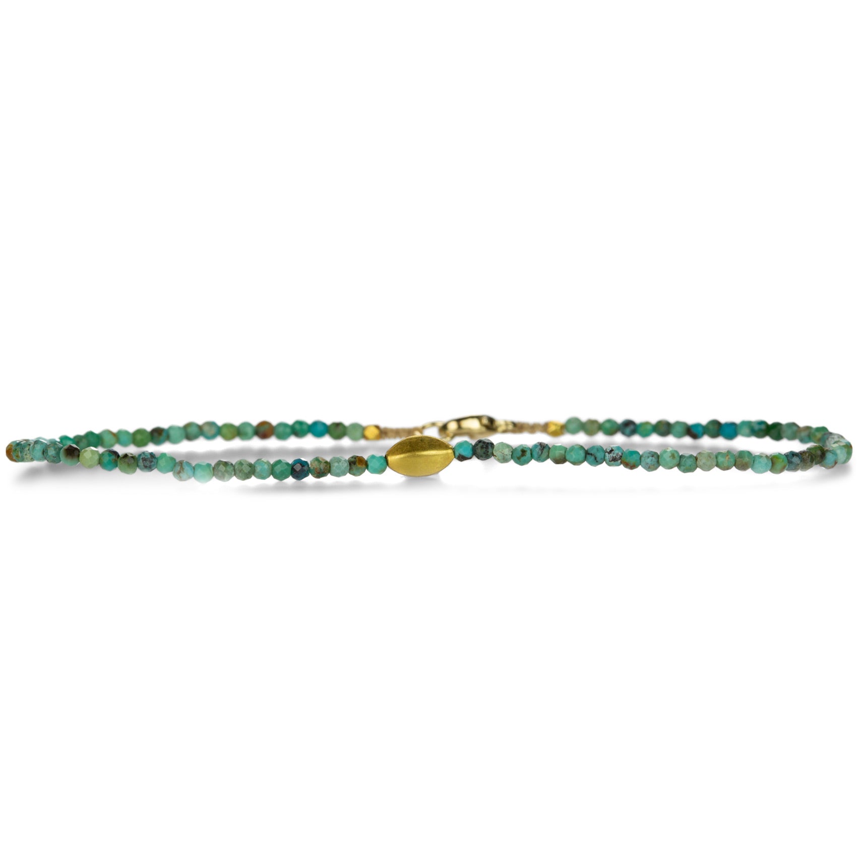 Perfect for layering, this faceted turquoise beaded bracelet from Margaret Solow would also make a delicate accent piece all on its own. With an elongated 18k yellow gold accent bead and a yellow gold lobster clasp, the total length measures 7". Handcrafted in Los Angeles, CA, U.S.