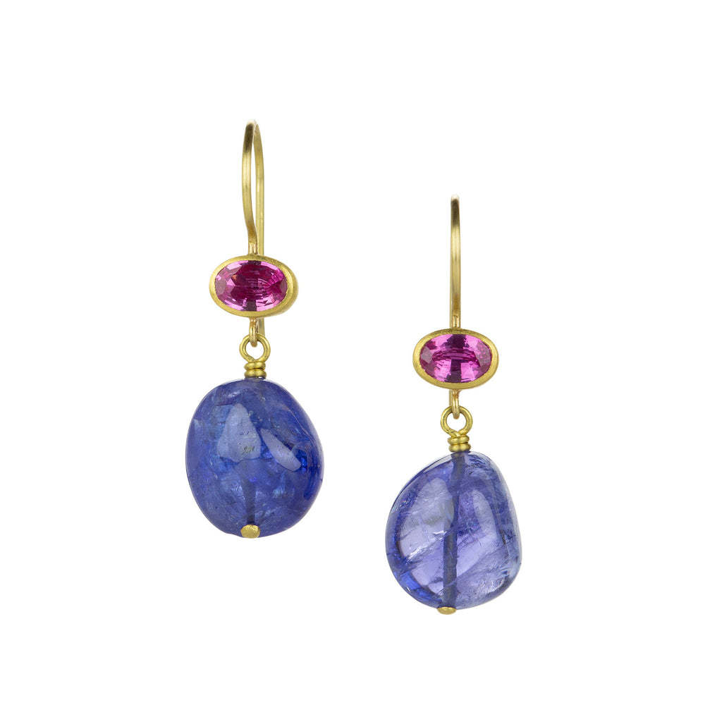 Jump into a brand new you in bright, festive colors and fresh, fun gemstone combos from Mallary Marks! This pair of 22k and 18k yellow gold earrings features bezel set oval hot pink sapphires totaling 0.80cttw with smooth organic tanzanite beads below. Total length with curved ear wires measures 1 1/4“. Handcrafted in New York, NY, U.S.