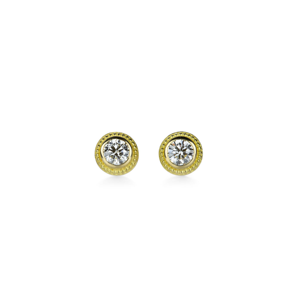 With a slight twist on the classic pair of diamond studs, Barbara Heinrich has created a beautiful version all her own. Crafted in 18k yellow gold, these sparkling G, VS quality diamonds totaling 0.74cttw are rimmed in a beautiful granulated bezel and are perfect for everyday wear. Studs measure just over 1/4” in diameter. Handcrafted in Rochester, NY, U.S.