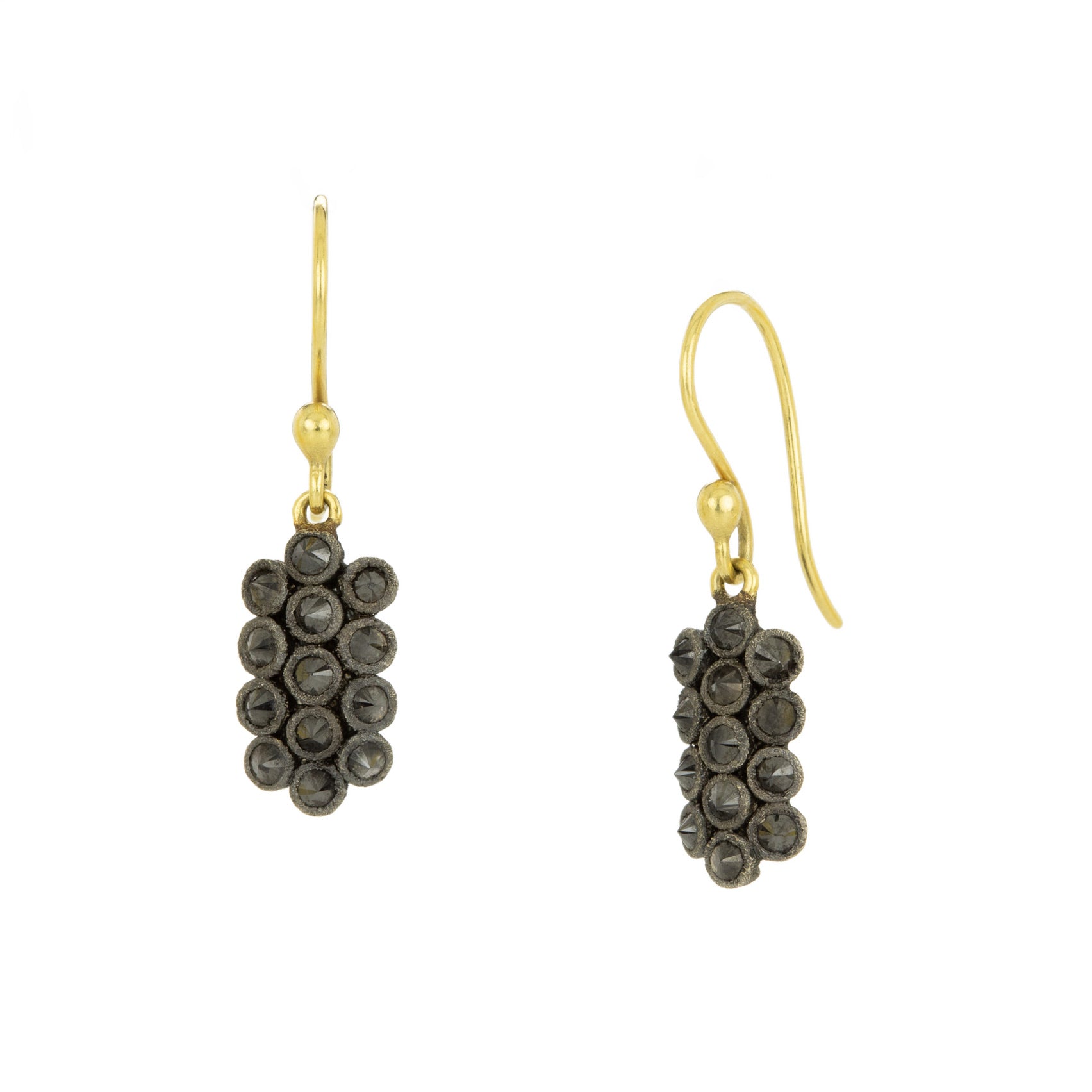 Take a drop from the honey hole in this pair of mixed metal earrings from Todd Pownell. 18k yellow gold ear wires hold a sumptuous pattern of darkened 14k white gold bezel set inverted black diamonds totaling 2.60cttw. Total length measures just under 1 1/4“. Handcrafted in Cleveland, OH, U.S.