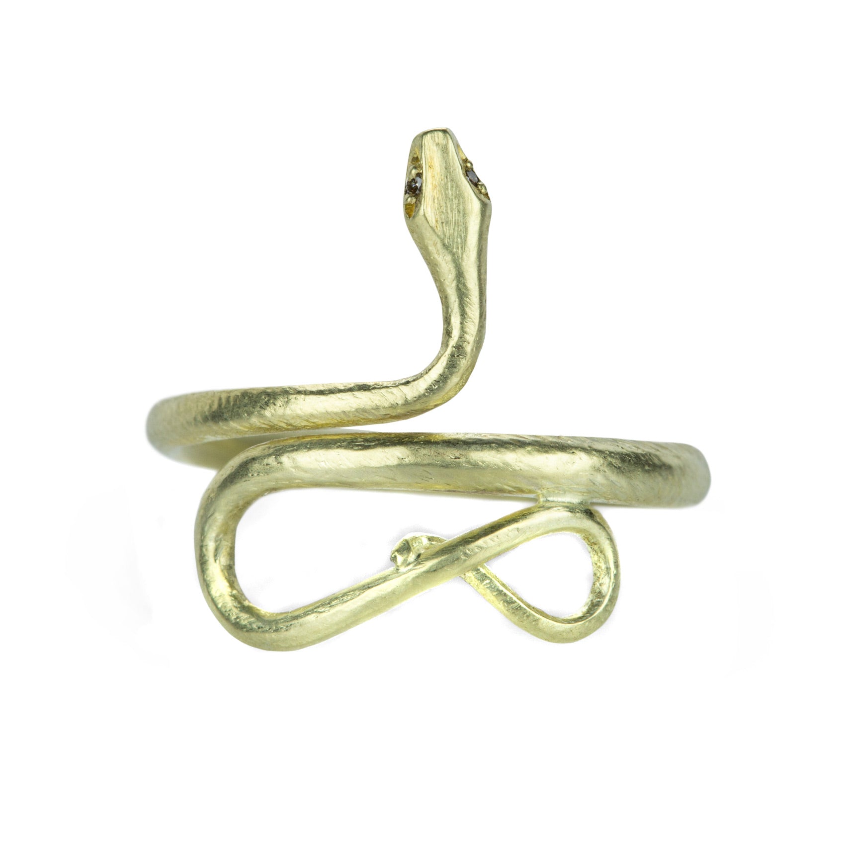 The serpentine lines in this Gabriella Kiss snake ring are simply exquisite. A symbol of eternal love, the small snake ring is handcrafted in textured 14k green gold, and features tiny diamond eyes for that magical spark. Size 7. Handcrafted in Hudson Valley, NY, U.S.