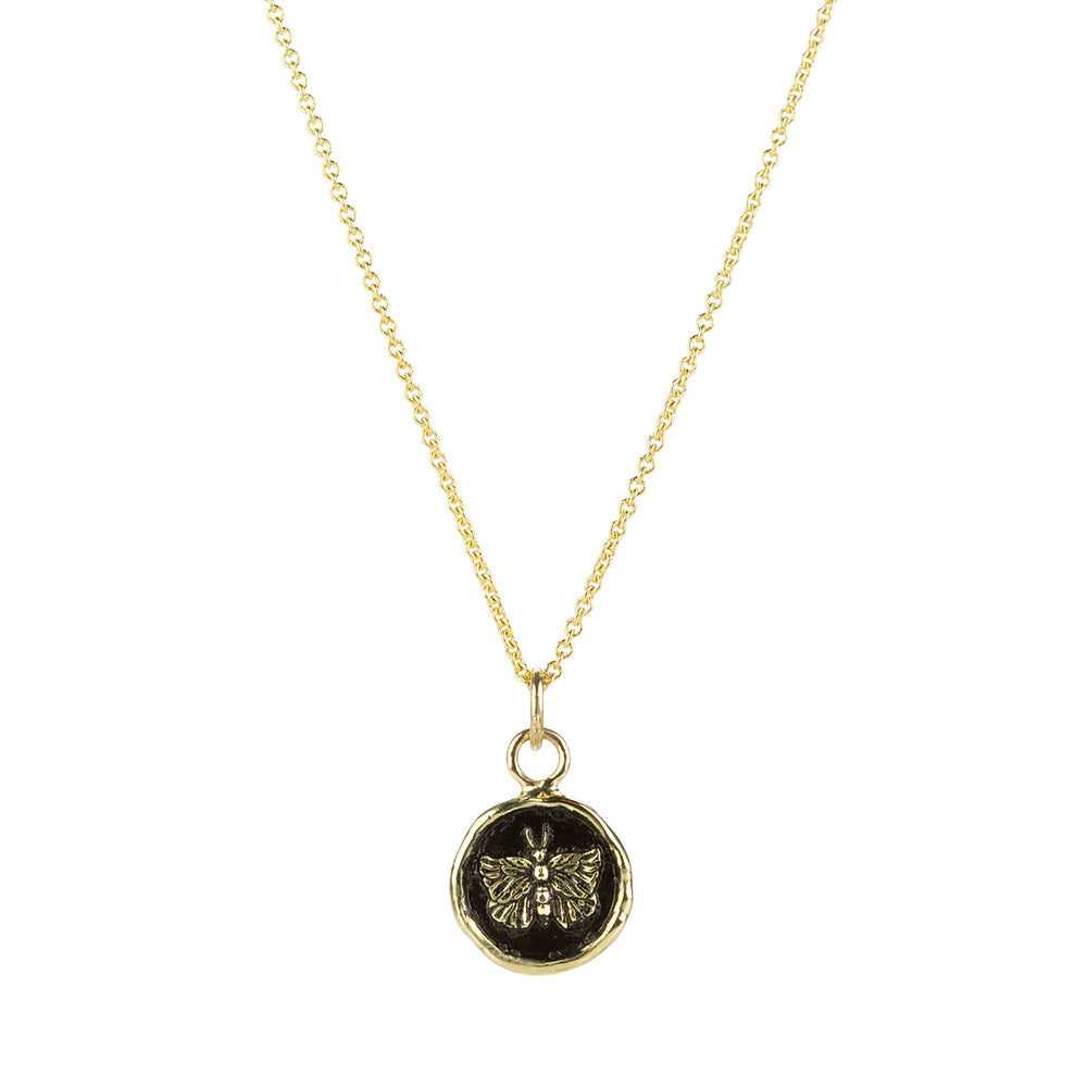 A symbol of the soul, rebirth, and transformation, this Pyrrha pendant features a beautiful butterfly. Lovingly and sustainably cast in recycled 14k yellow gold with a layer of black ceramic, this potent talisman hangs on an 18" fine cable chain with lobster clasp. Consider adding a Pyrrha attraction charm to this piece for an extra layer of color and meaning. Pendant measures just over 1/2” in total length, including bail. Handcrafted in Vancouver, Canada.