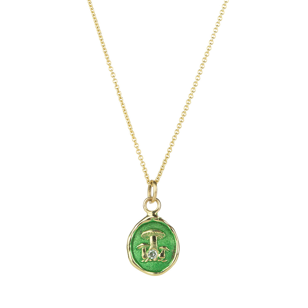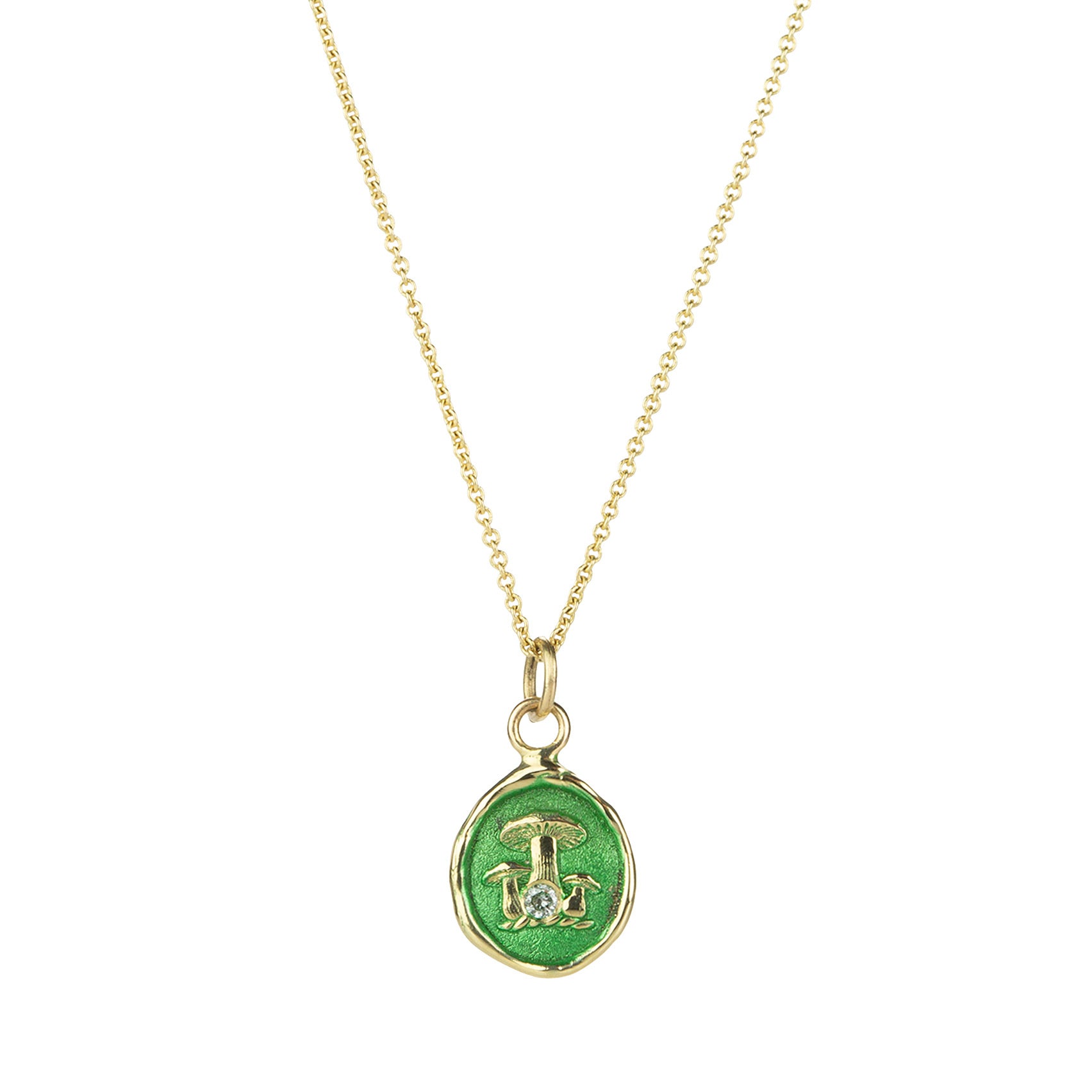 Celebrate what you love about yourself or cherish in others. The trio of mushrooms on this Pyrrha pendant is symbolic of remaining connected with the natural world. Lovingly and sustainably cast in recycled 14k yellow gold with a layer of emerald green ceramic, this potent talisman hangs on an 18" 14k yellow gold fine cable chain with lobster clasp. Pendant measures 5/8" in length, including bail. Handcrafted in Vancouver, Canada.