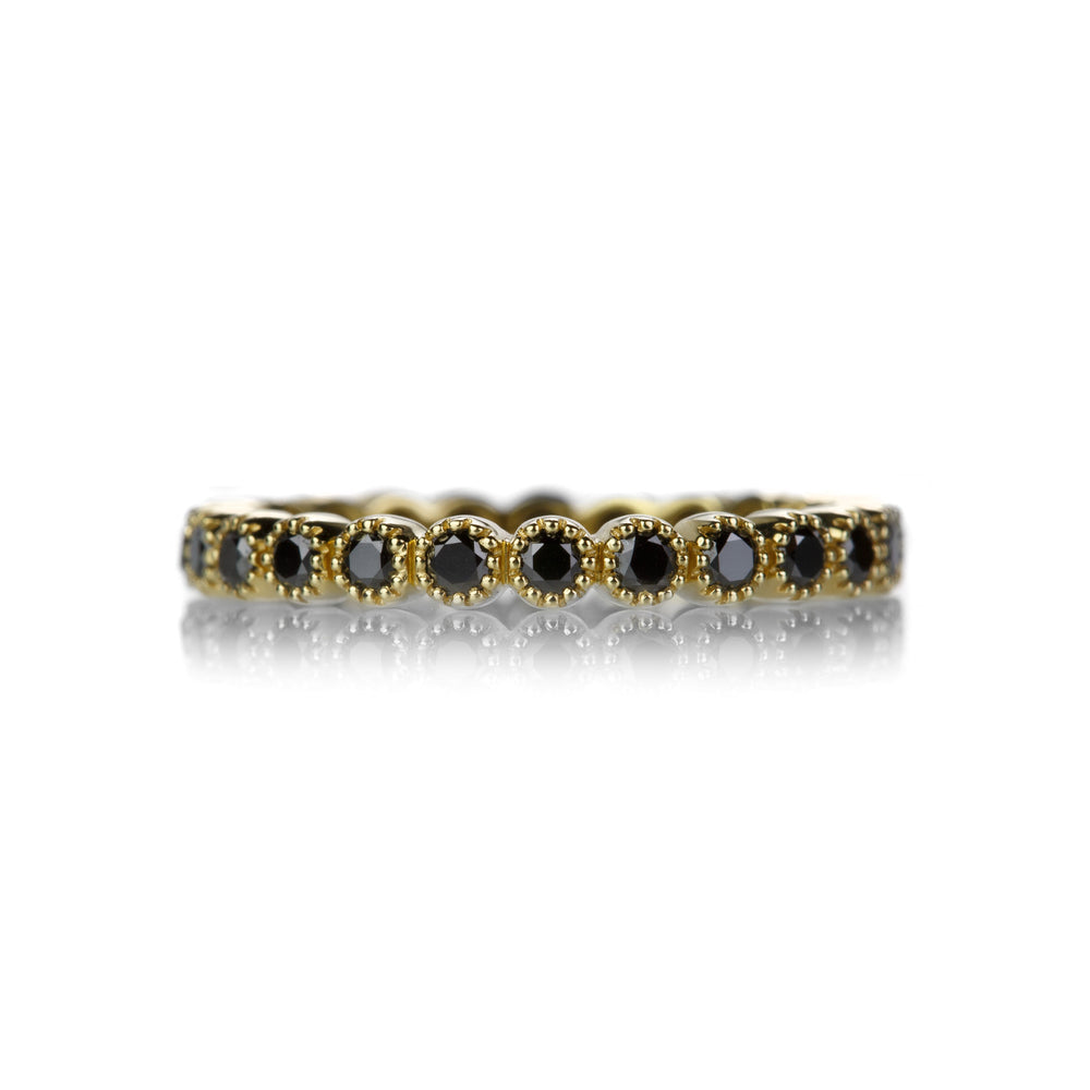 Milgrain detailed bezels set this 18k yellow gold band from Sethi Couture apart from the ordinary. Black diamonds totaling 0.71cttw dance the eternal night away. Size 6.25. Handcrafted in Indore, India.