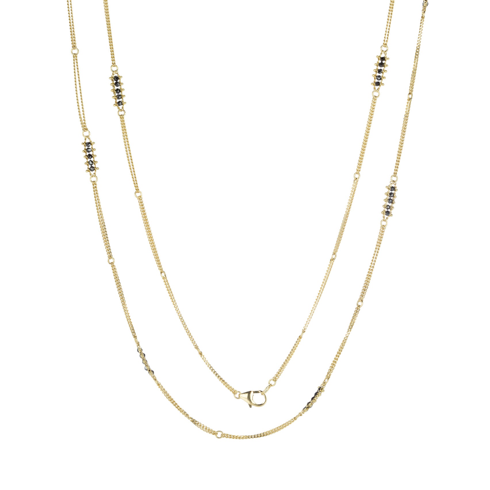 Simplicity at its most divine! This sweet, delicate 18k yellow gold Amali necklace is light and lovely, featuring woven stations of faceted black diamond beads for a touch of pure perfection. This would make a thoughtful gift as a modern, wearable twist on traditional diamonds. Total length with lobster clasp measures 34". Handcrafted in New York, NY, U.S.