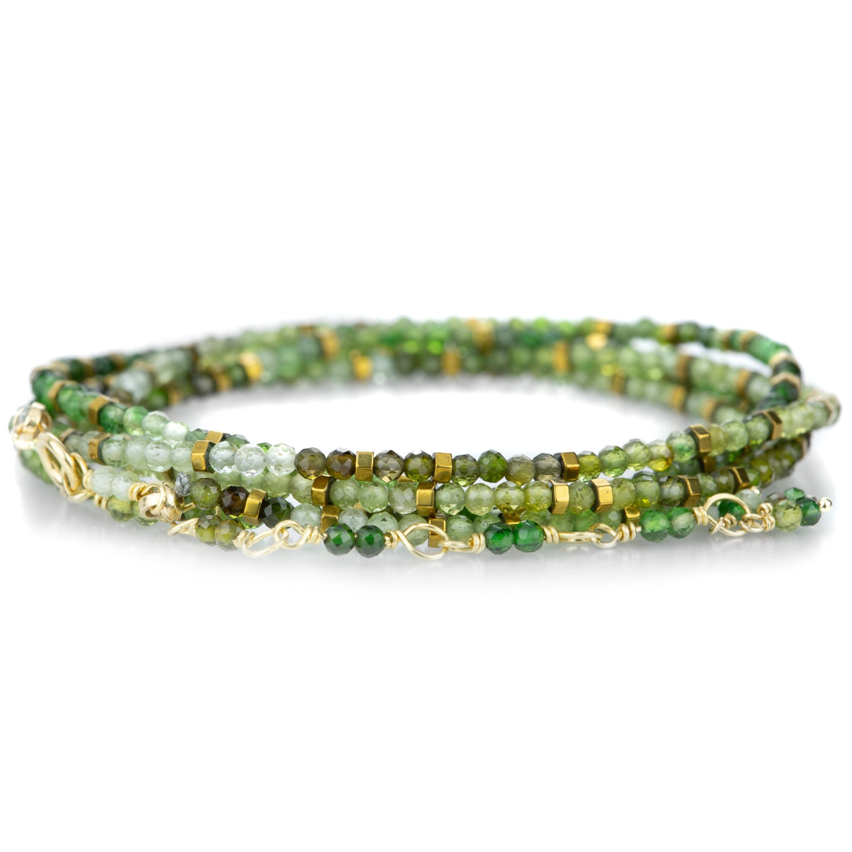 Proclaim your original sense of style with an Anne Sportun wrap bracelet! Brilliantly layered with faceted green tourmaline beads and square pyrite beads sprinkled throughout, this bracelet adds five rows of sparkling color to your wrist stack. A truly versatile piece, it can also be worn as a long necklace, or wrapped around twice for a shorter layered look. Bracelet measures up to 34" with a wire wrapped 2" extension and spring ring clasp. Handcrafted in Toronto, ON, Canada.