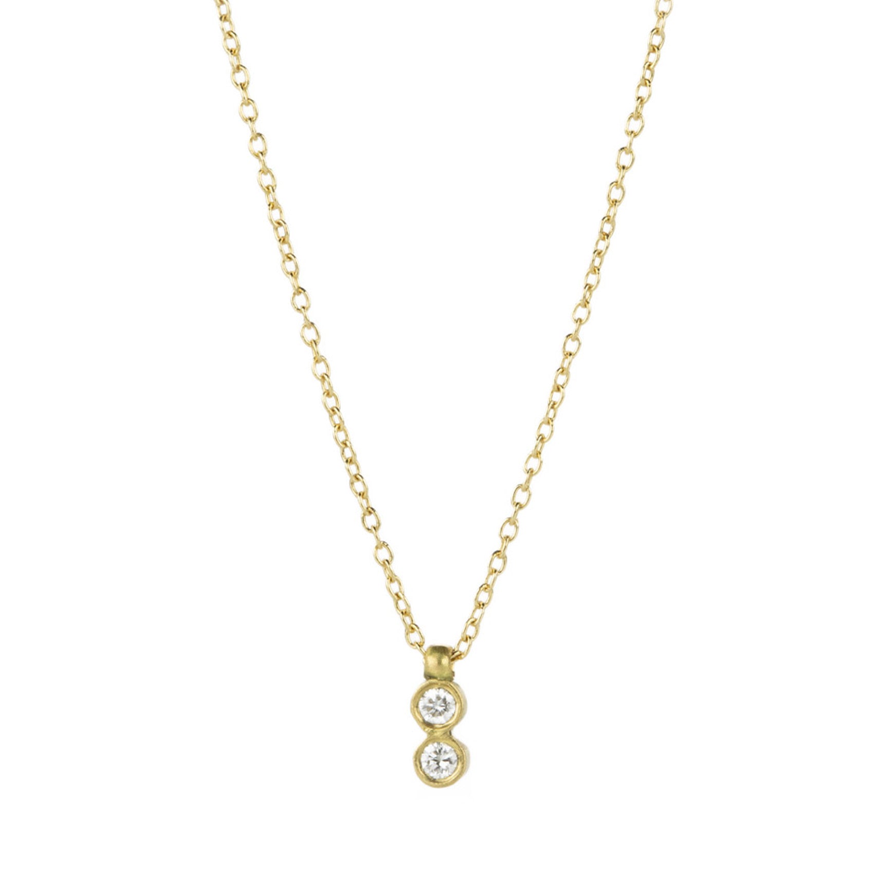 Drop a spot of sparkle into your day with this 18k yellow gold necklace from Marian Maurer. Two tiny diamonds totaling 0.05cttw are bezel set in a double brushed gold pendant. Perfect for layering or gifting! Total length measures 16". Handcrafted in Brooklyn, NY, U.S.