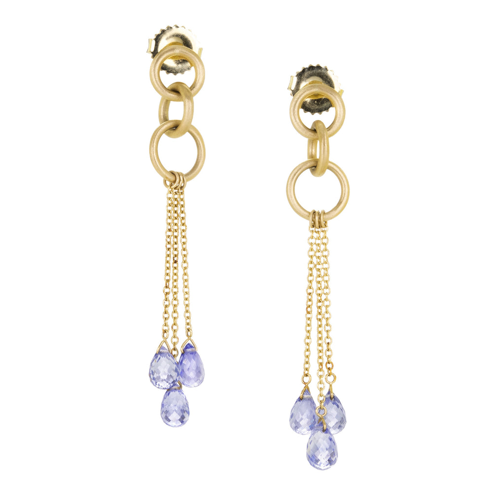 Sprinkle a little magic into your look in these 18k yellow gold posted drop earrings from Fannie Thomas! A sensually satin-finished section of round link chain holds three more delicate chains with sparkling sapphire briolettes totaling 5.08cttw Total length measures 2". Handcrafted in San Antonio, TX, U.S.
