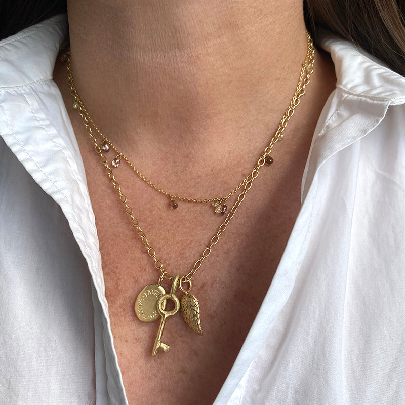 Find positivity no matter where you turn in this 18k yellow gold charm pendant from Fannie Thomas! The charm reads; Faith, Hope, Love on the front and Joy on the back of the pendant. Pendant measures 7/8" including bail. Chain is sold separately. Handcrafted in San Antonio, TX, U.S.