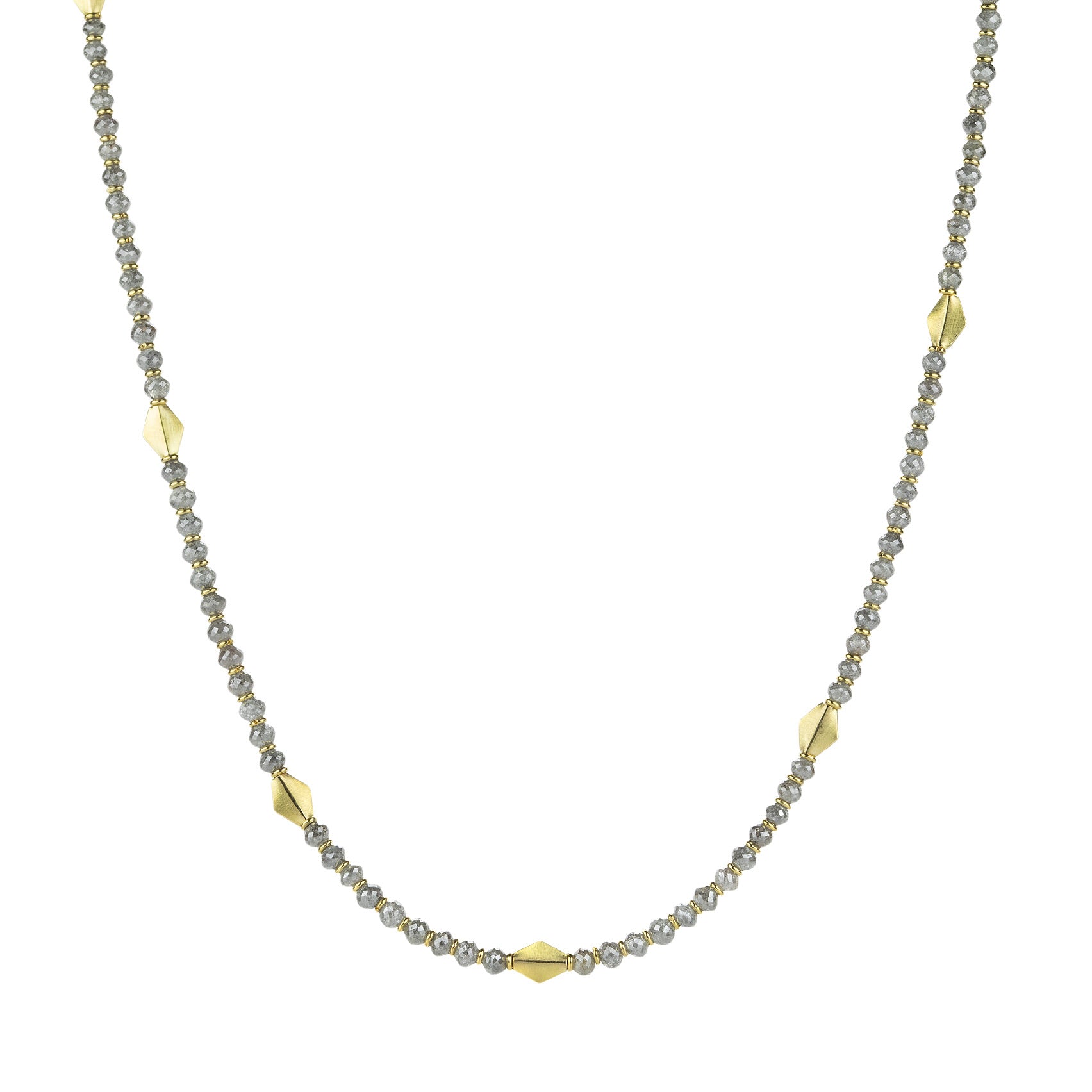Flashy faceting adds an exciting, geometrical element to an organic form in this 18k yellow gold necklace from Barbara Heinrich. Natural light gray diamond beads totaling 21.84cttw are interspersed with eight kite shaped gold spacers and tiny gold jump ring spacers. This artistically arranged piece is subtle, yet substantial and full of sparkle! Total length measures 16 1/2“ with a 1 1/2“ extension chain. Handcrafted in Rochester, NY, U.S.