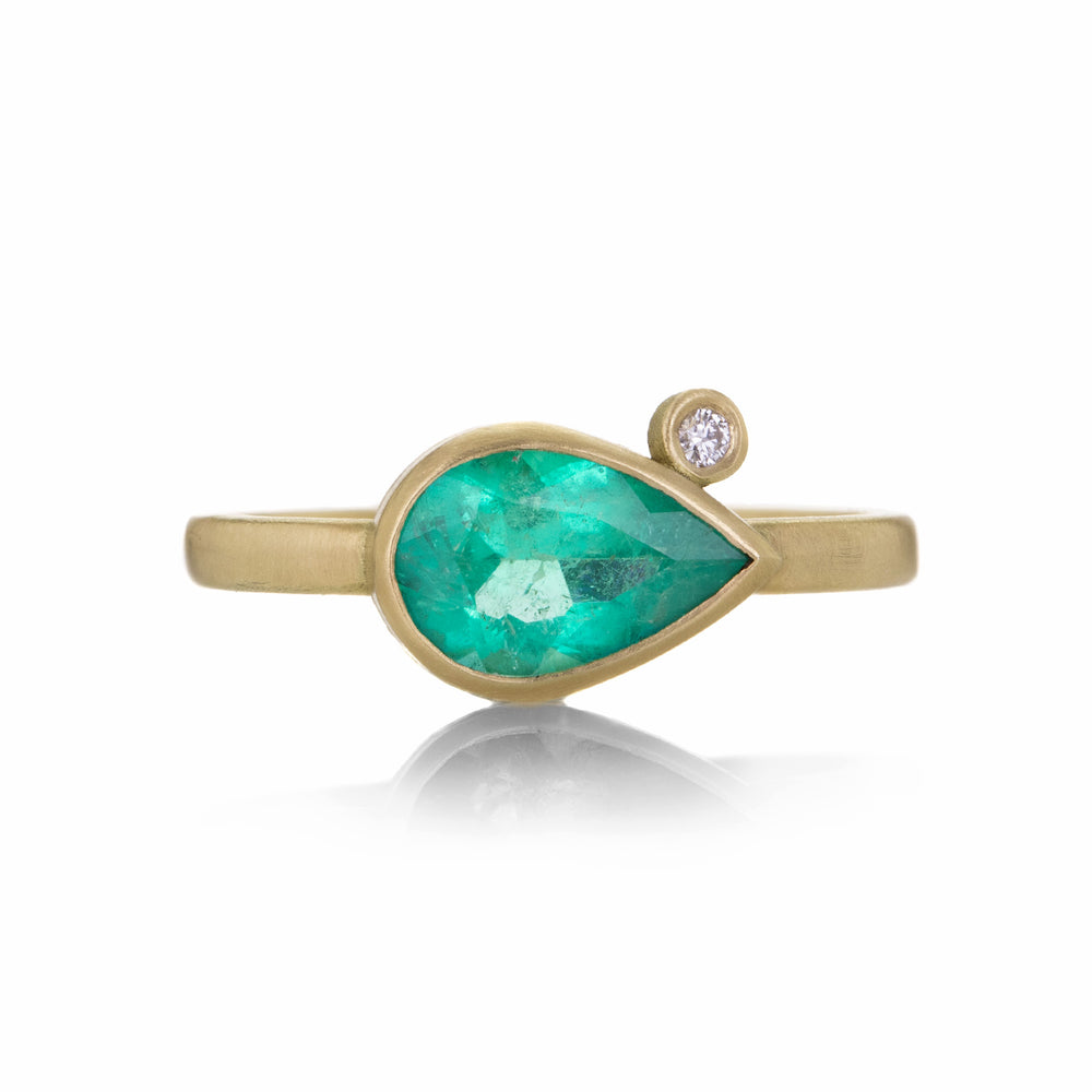 This 18k yellow gold ring from Ananda Khalsa glows with an unforgettable beauty. A light green faceted pear shaped emerald is set east-west on the band for a hit of unexpected flair. The stone sparkles with a small round brilliant cut satellite diamond accent. Emerald measures 3/8" x 1/4" including bezel. Size 6. Handcrafted in Northampton, MA, U.S.