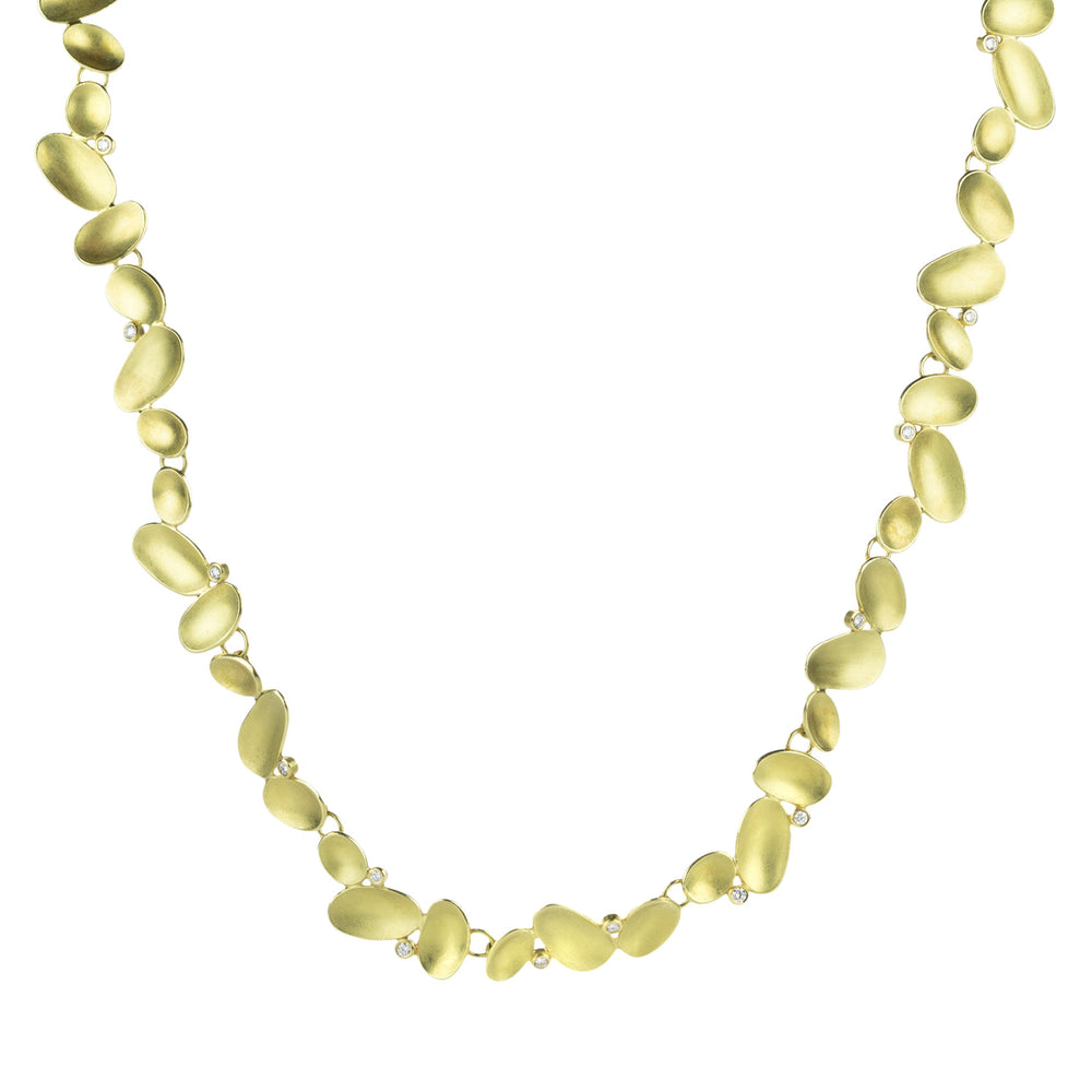 Find your treasure hidden amongst the shells in this intriguing 18k yellow gold necklace from Barbara Heinrich. Linked clusters of shell forms twinkle with scattered, bezel set diamonds totaling 0.30cttw. Total length with clasp measures 17 1/4“. Handcrafted in Rochester, NY, U.S.