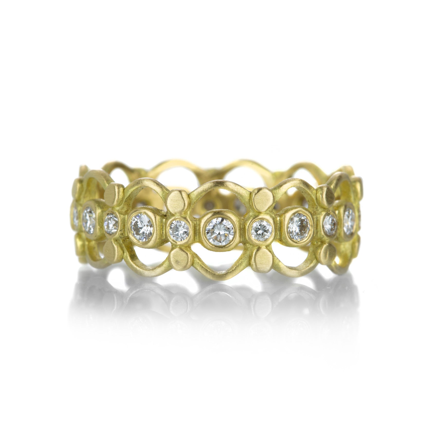 Dress yourself in the delicate details of this flirty, feminine 18k yellow gold band from Marian Maurer. The scalloped, satiny smooth structure features plenty of magical sparkle with white bezel set diamonds totaling 0.50cttw.Size 7. Handcrafted in Brooklyn, NY, U.S.