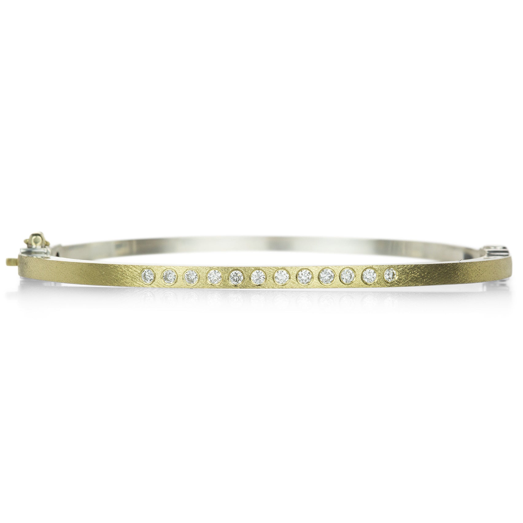 Snap into a layer of luxe with a stylish mixed metals edge in this hinged bangle from Rene Escobar. Crafted in sterling silver with a layer of 18k yellow gold on the top half, a row of twelve white diamonds totaling 0.24cttw brings the sparkle to your stack! A meticulous cross hatching finish adds luxurious texture, along with a silver and 18k yellow gold snap lock clasp. Bangle measures 2.5mm wide. Inner diameter measures just under 2” x 2 1/4". Handcrafted in Miami, FL, U.S.