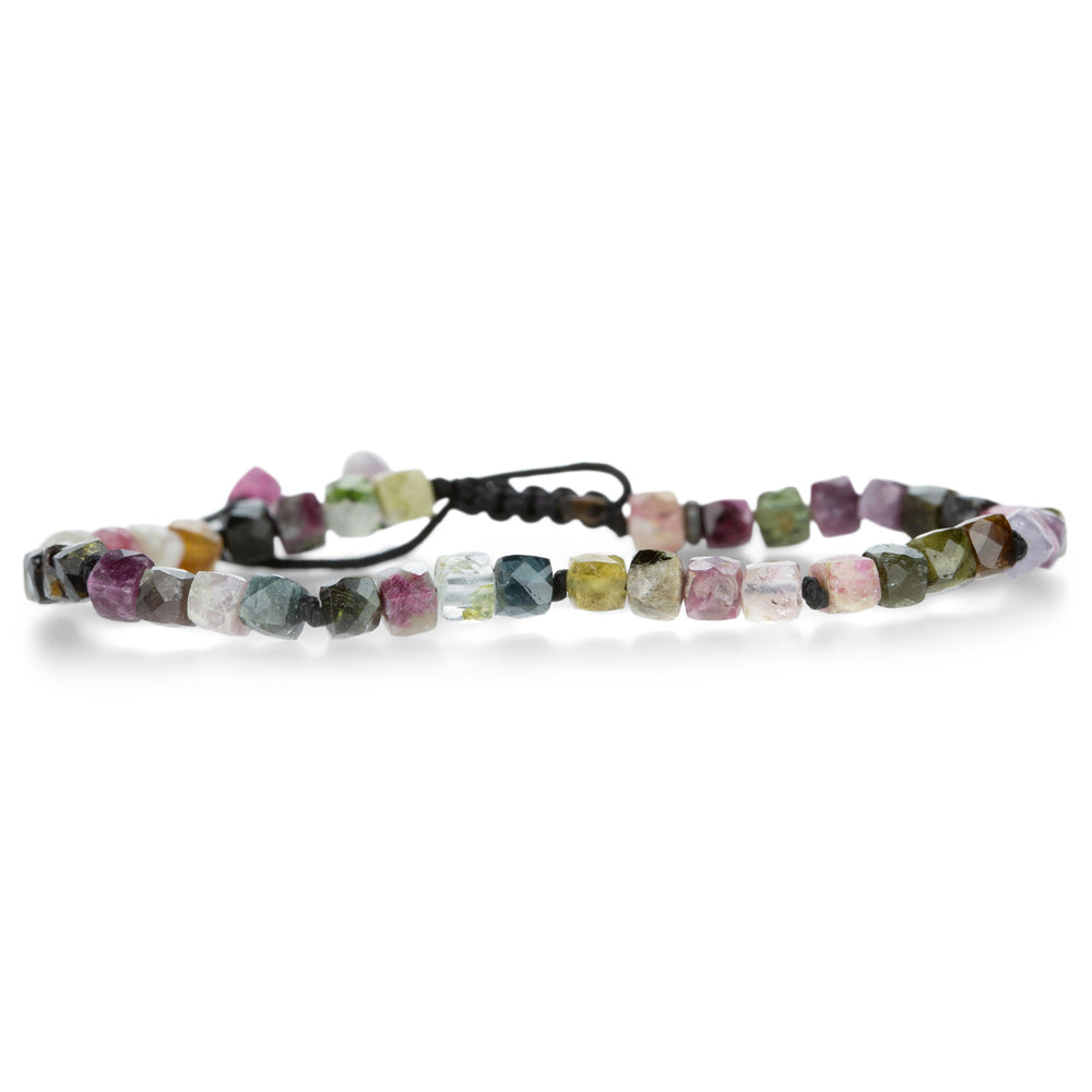This 4mm multicolored tourmaline cube beaded bracelet from Joseph Brooks is strung on an adjustable cord, with the artist's initials on a sterling silver charm. This stone heals troubled hearts. It gives the strength to let go of the old and see things through fresh clear eyes, giving hope and strength. Handcrafted in Los Angeles, CA, U.S.