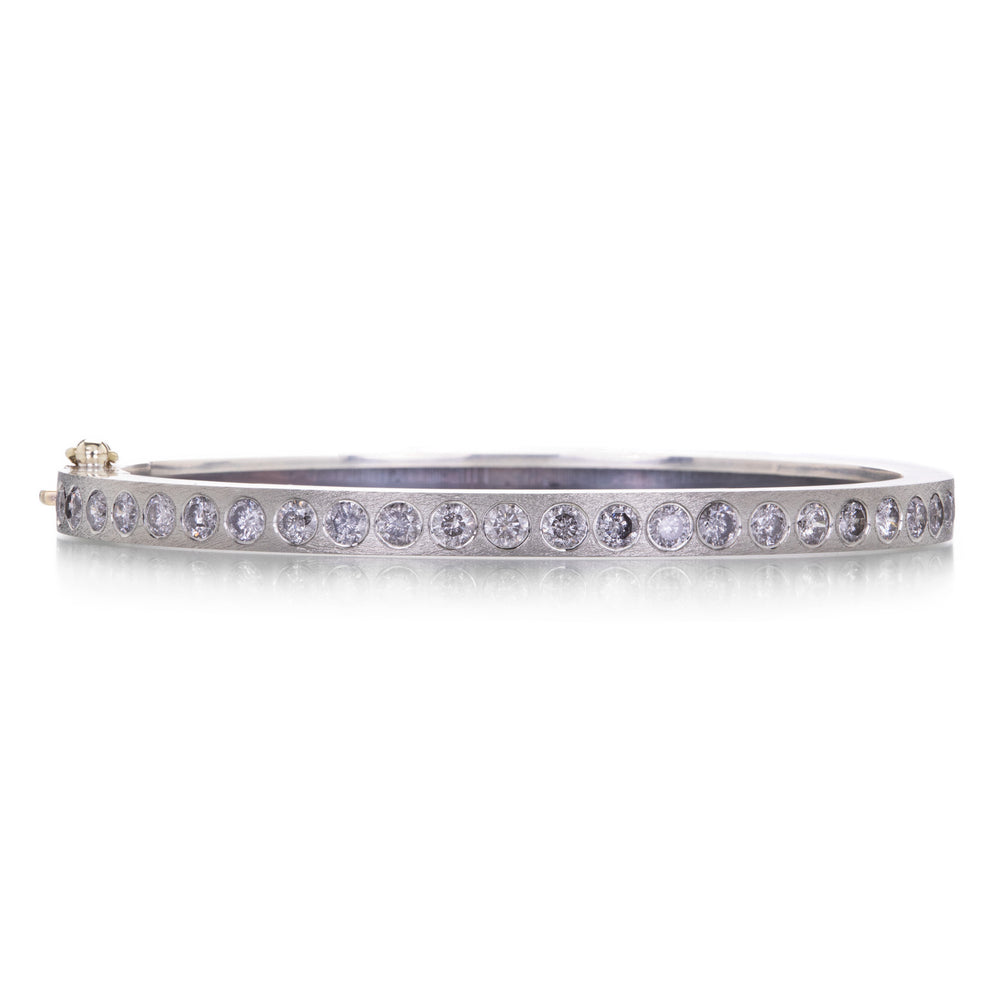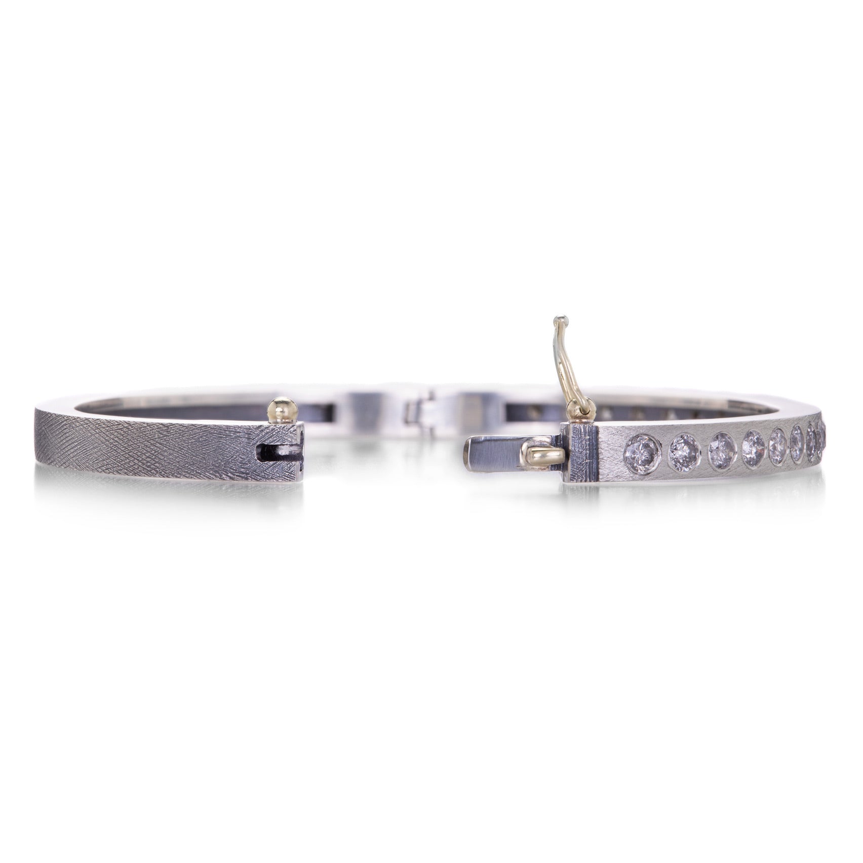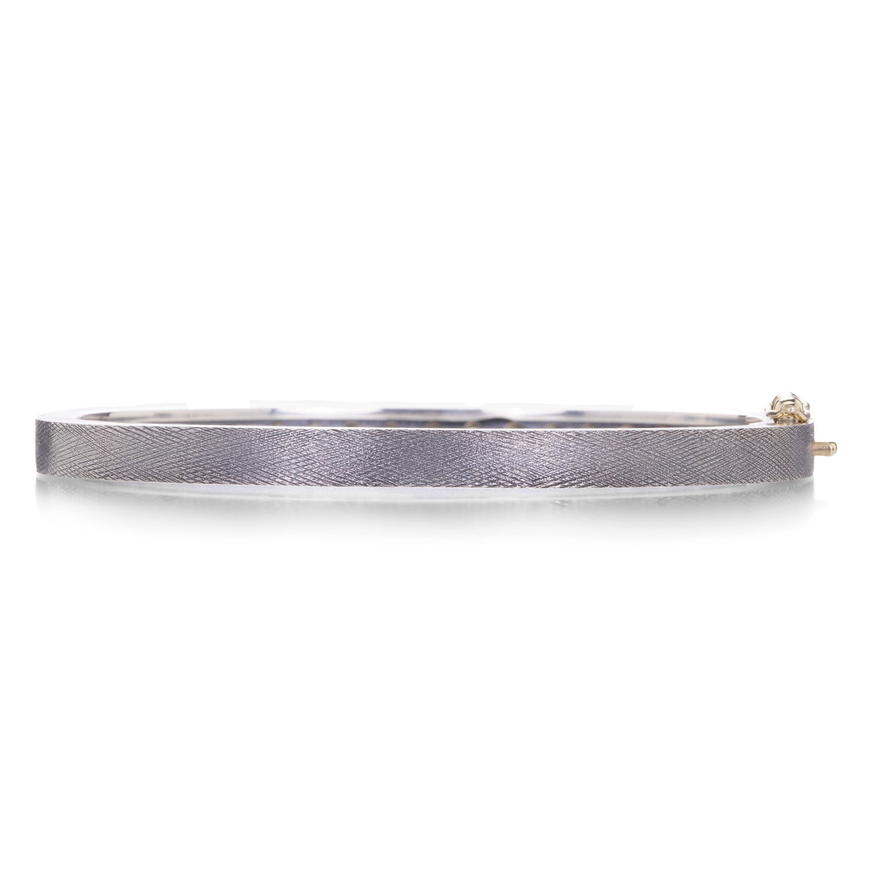 Embrace the beauty of precious mixed metals and diamonds galore! This 4mm sterling silver and 18k white gold hinged bangle from Rene Escobar has it all, with a sparkly row of surface set salt and pepper diamonds totaling 2.30cttw on a meticulously crosshatched finish. A snap lock class with safety latch keeps this luxurious piece safe and secure. Inner diameter measures 2 1/4" x 1 7/8". Size medium. Handcrafted in Miami, FL, U.S.