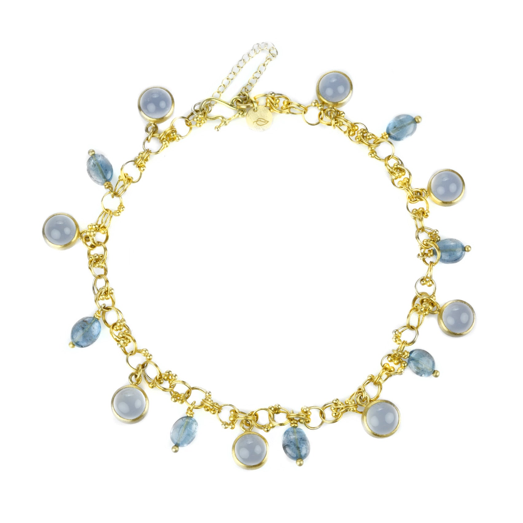 Let the softness of pale blue lift your spirit and bring you joy! This 22k and 18k yellow gold bracelet from Mallary Marks features an intricately crafted chain with alternating dark blue aquamarine cabochon drops totaling 4.61cttw and round, bezel set chalcedony drops in a dancing fringe. Total length measures 7 1/2” with locking hook clasp and safety chain. Handcrafted in New York, NY, U.S.