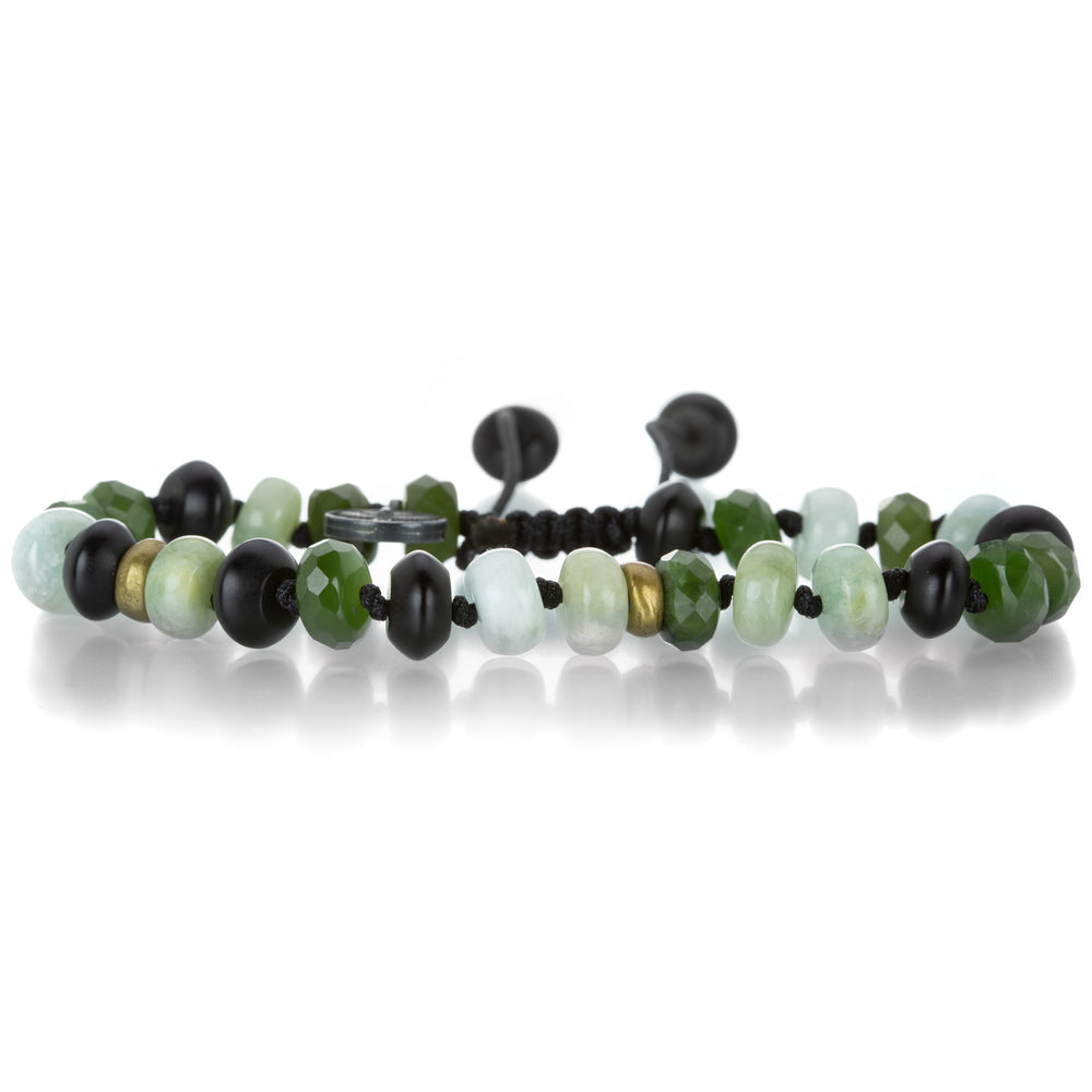 This 8mm smooth beryl, jade and onyx beaded bracelet from Joseph Brooks is strung on an adjustable cord, with the artist's initials on a sterling silver charm. Beryl is believed to enhance courage, and alleviate whatever stress one is under. The pure green of jade is associated with abundance in the heart chakra giving this stone a powerful energy to bring abundant healing to one's heart. Onyx is a stone actively associated with inner strength, willpower and discipline. Handcrafted in Los Angeles, CA, U.S.