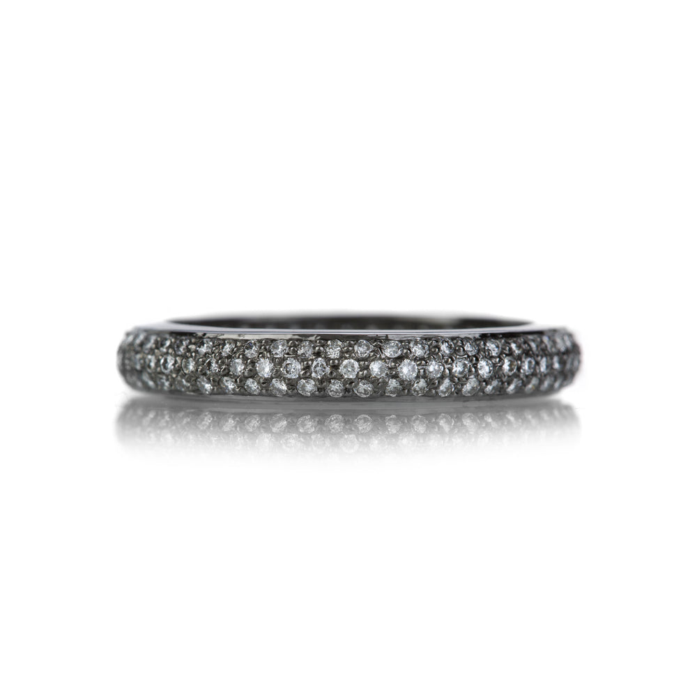 Add a little drama to your stack with this 18k white gold black rhodium plated tire band from Sethi Couture. Featuring pavé white diamonds totaling 0.65cttw, this bold ring has a subtle, sparkling glamour about it. With plenty of volume, this piece possesses maximum sparkle without feeling oversized. Size 6. Handcrafted in Indore, India.
