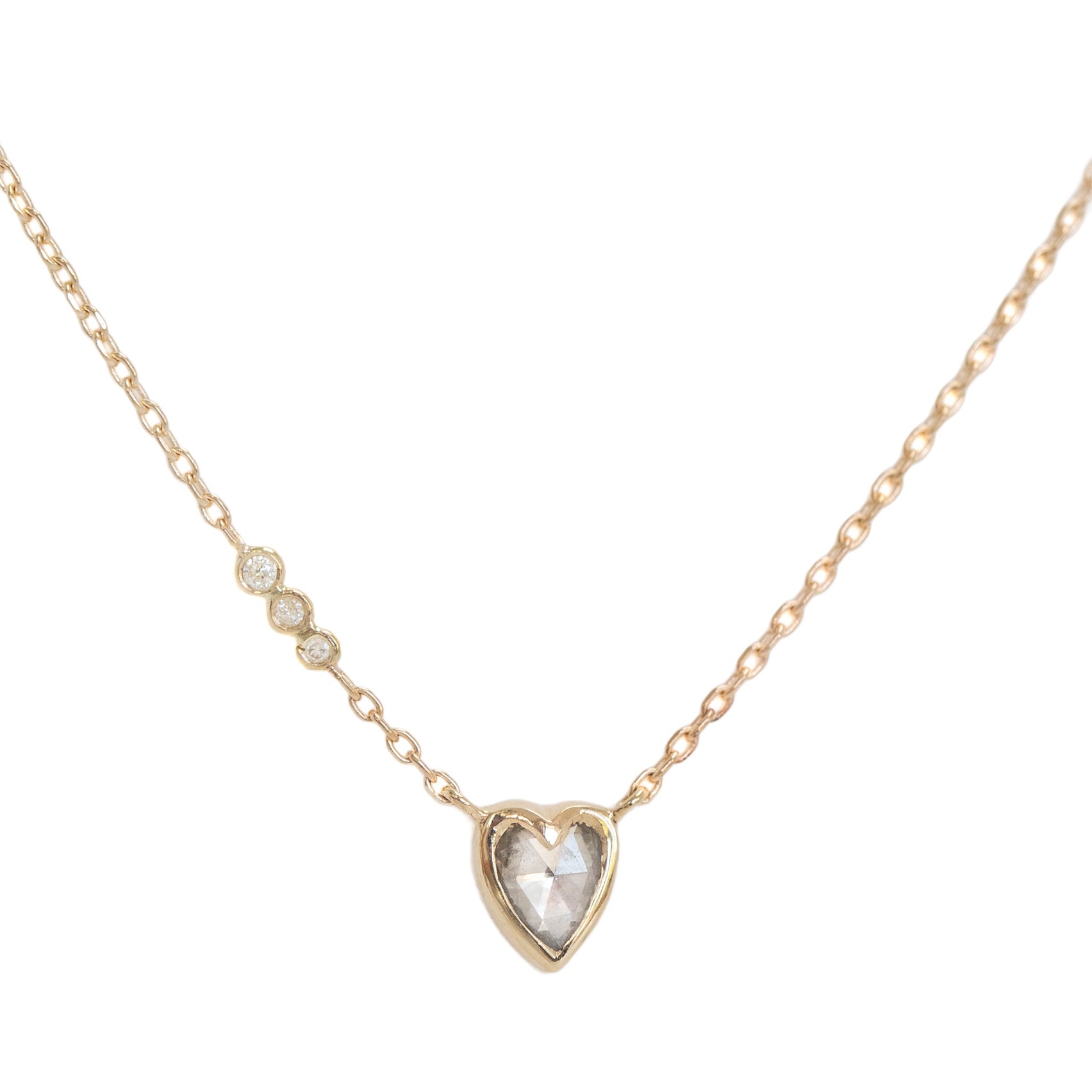 A 14k yellow gold chain with three bezel set diamonds and a heart shaped, rose cut heart shaped diamond pendant. Pendant measures 1/4" on a 15" -16" chain. Handcrafted in Belgium.