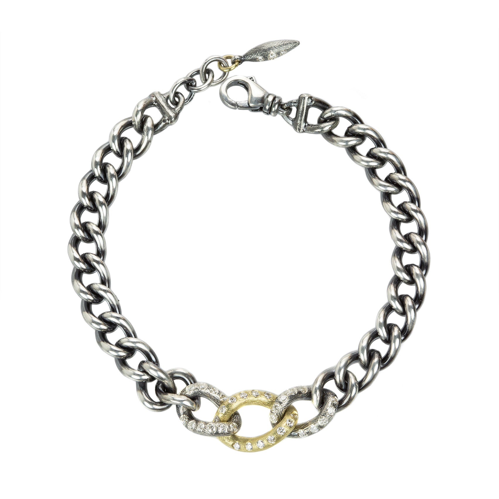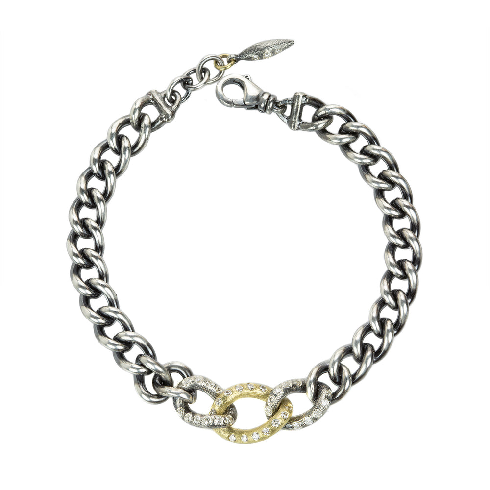 Ladies and gents, your new favorite bracelet has arrived! This sterling silver curb link chain bracelet from Rene Escobar features two slightly graduated diamond studded silver links with a larger 18k yellow gold link in the center with white diamonds totaling 0.40cttw. Total length with a swivel lobster clasp measures 7 7/8". Handcrafted in Miami, FL, U.S.