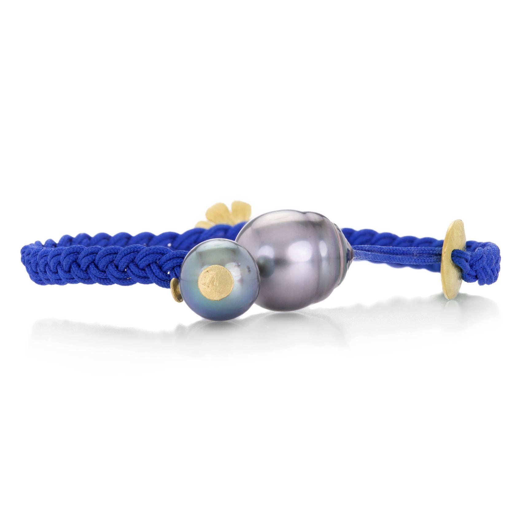 Enjoy a taste of resort luxury in this braided deep blue nylon cord bracelet from Lene Vibe. An 18k yellow gold carved floral element centers the piece with accent diamonds totaling 0.06cttw, while two Tahitian pearls highlight the button style clasp. Total length measures 6 1/2“. Handcrafted in Denmark.