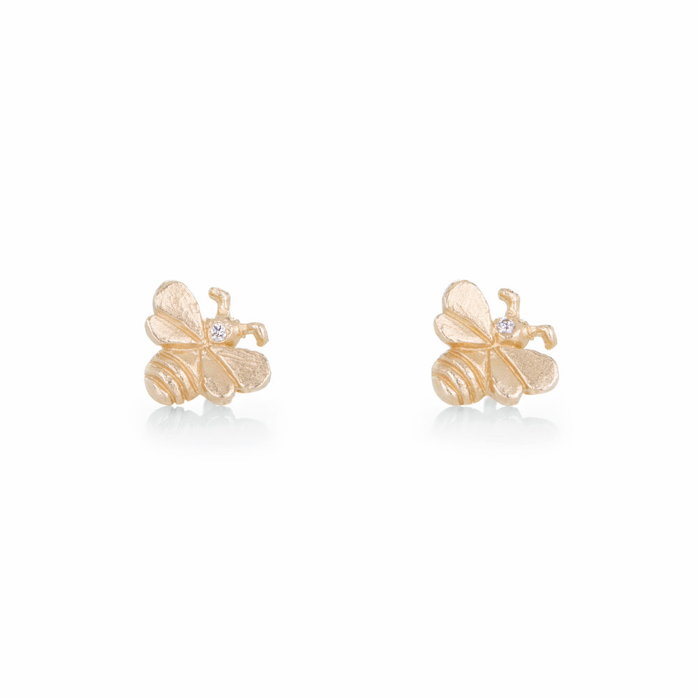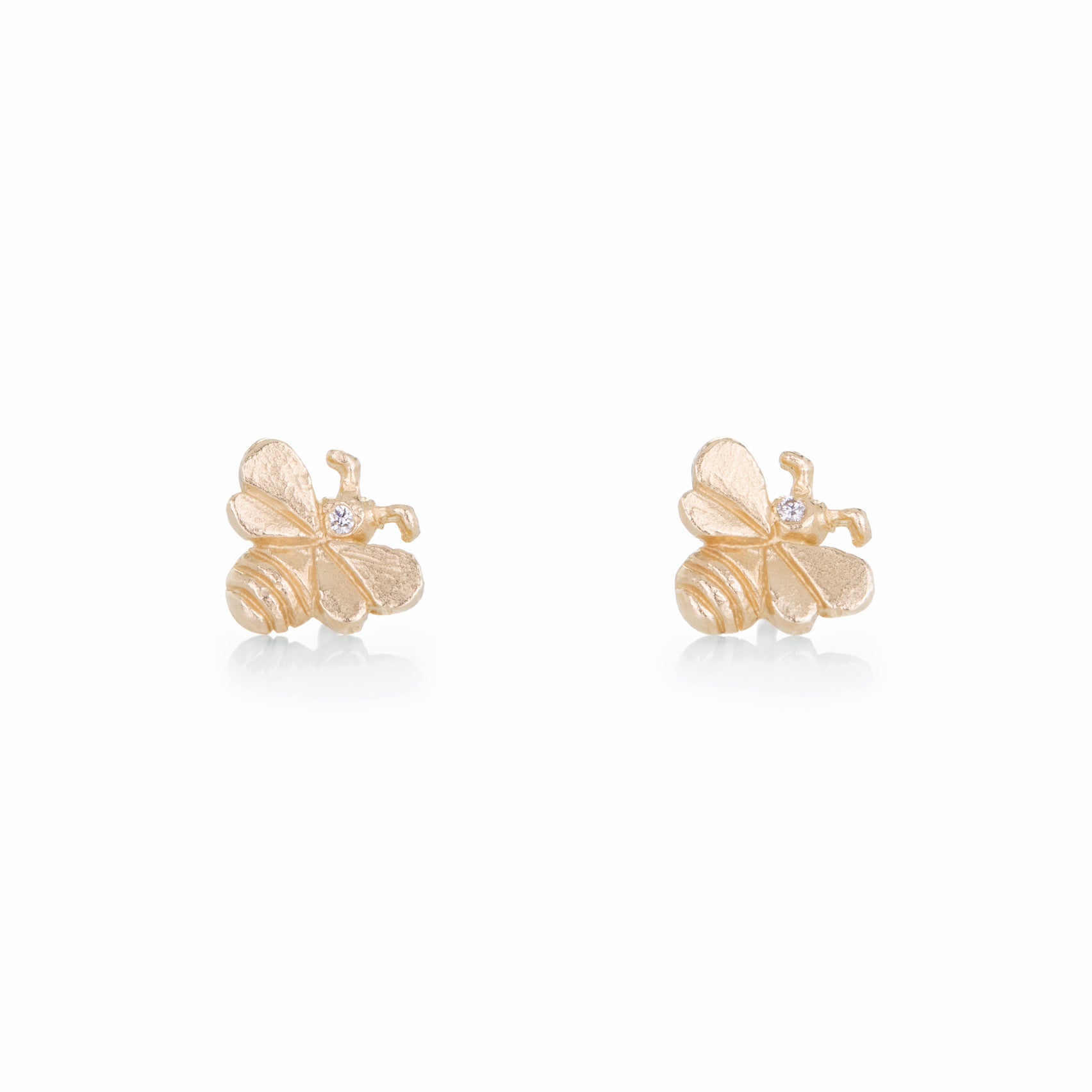 Charm your lobes with a flash of fiery fun in this pair of 14k yellow gold studs from Victoria Cunningham. The plump, detailed bees feature sparkling diamond heads. Earrings measure just over 1/4” x 1/4". Handcrafted in Los Angeles, CA, U.S.