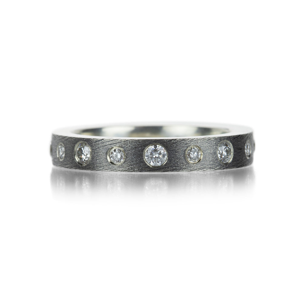 Deepen into the details of this sterling silver band from Rene Escobar, featuring a dance of multi sized faceted white diamonds totaling 0.55cttw. The meticulous surface texture adds a sultry richness to this luxe layer. Band width measures 3mm. Size 6.75. Handcrafted in Miami, FL, U.S.