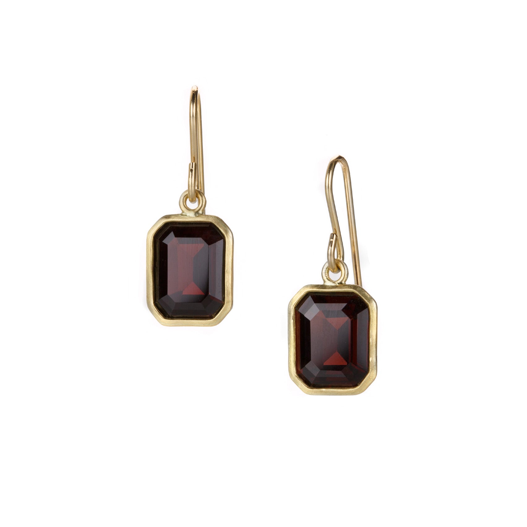 This pair of 18k yellow gold earrings from Maria Beaulieu features bezel set emerald cut deep garnet drops, glimmering with subtle color. These sultry gems will satisfy any craving for passion! Stones measure 8mm x 11mm. Total length with curved ear wires measures 7/8”. Handcrafted in Brooklyn, NY, U.S.